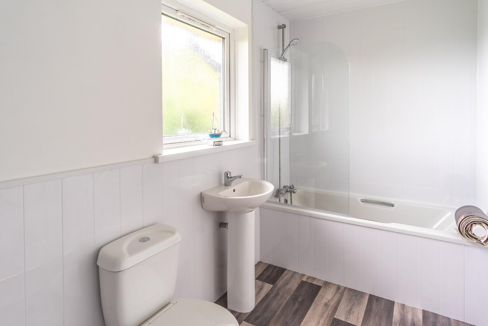 White suite comprising low flush WC, pedestal wash hand basin, panel bath with shower extension, PVC wall panelling.