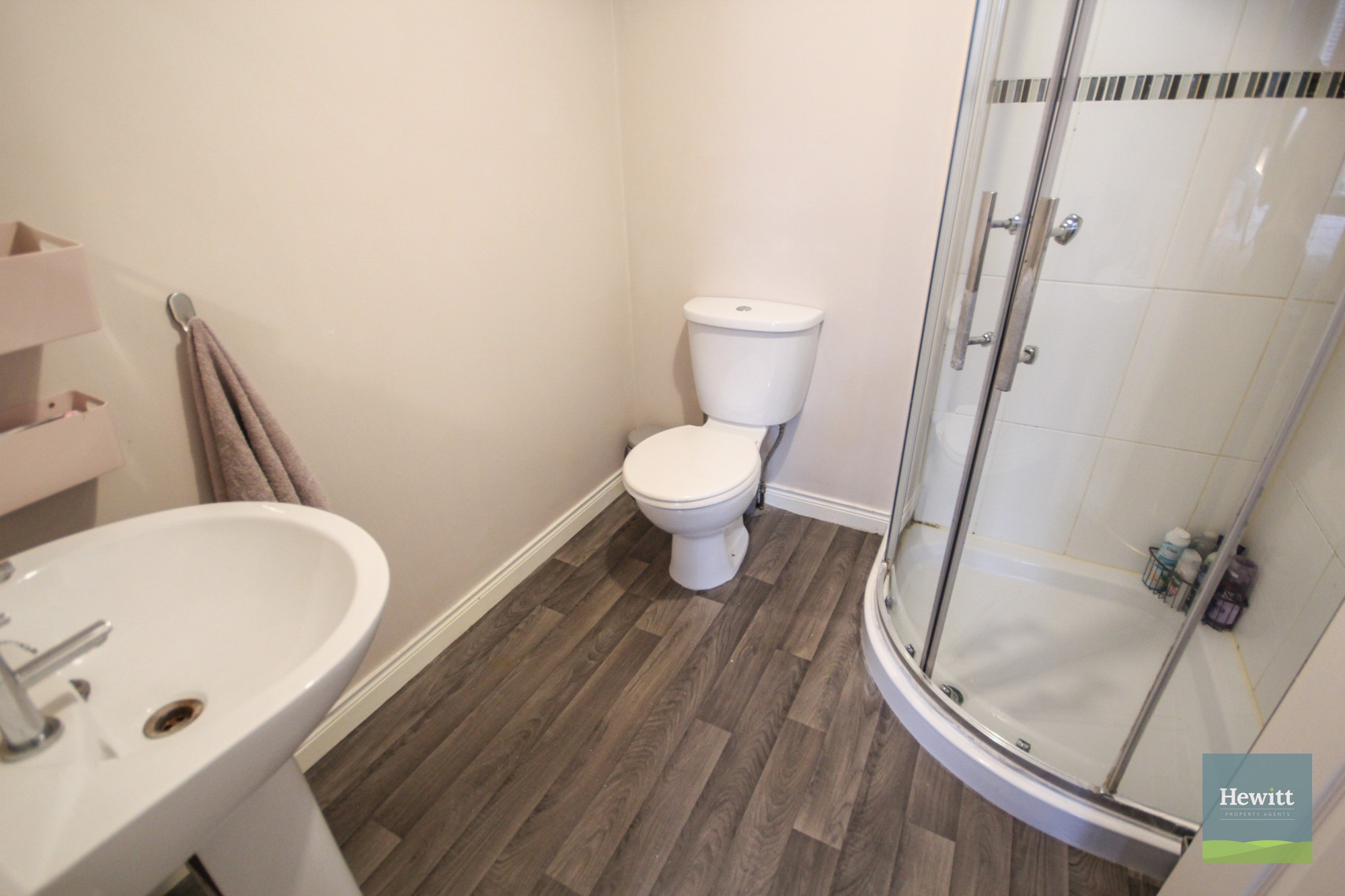 Lino wood effect floor. Wash hand basin. WC. Shower.