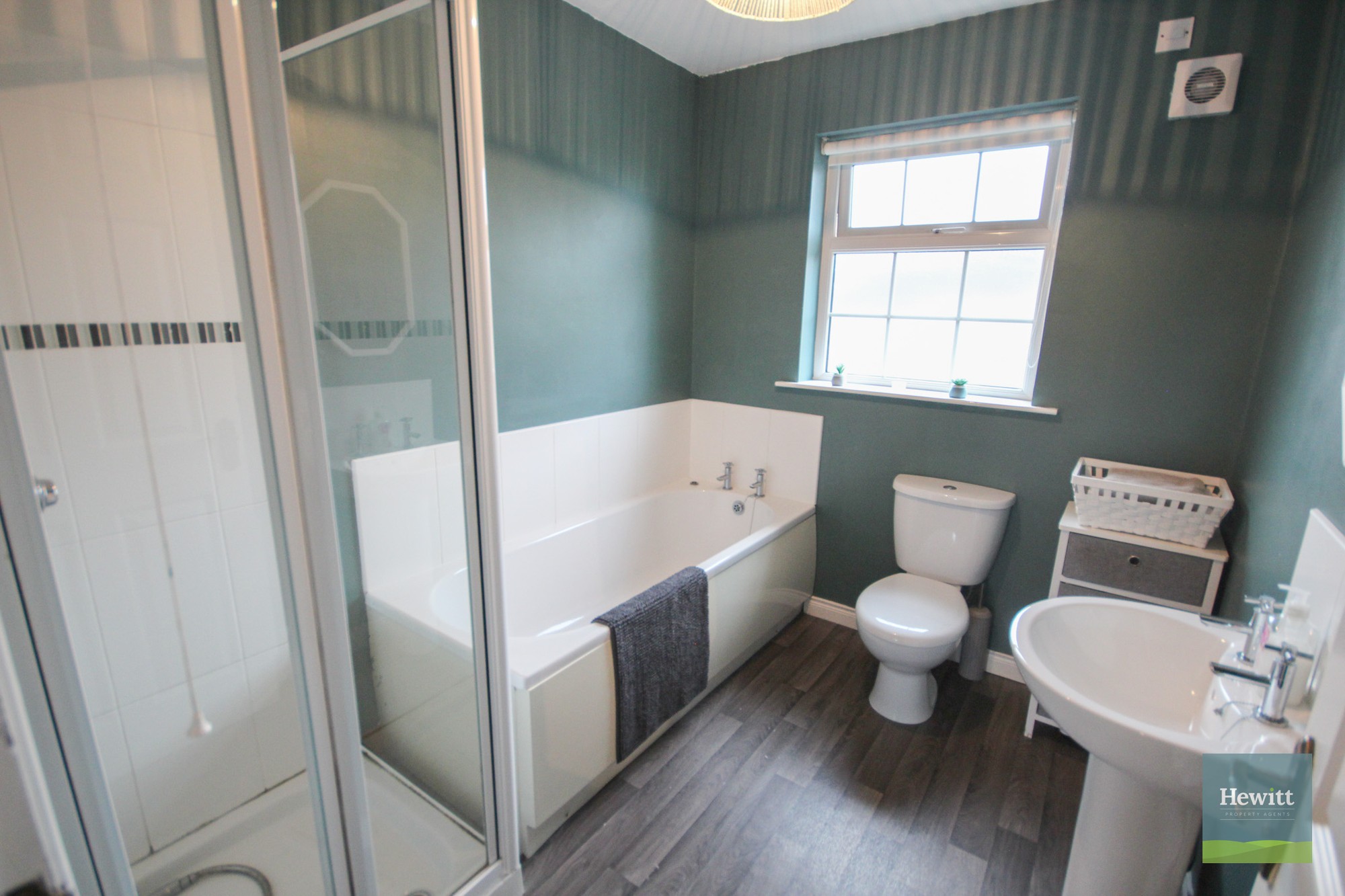 Lino Wood effect floor. WC. Wash hand basin. Shower. Bath.