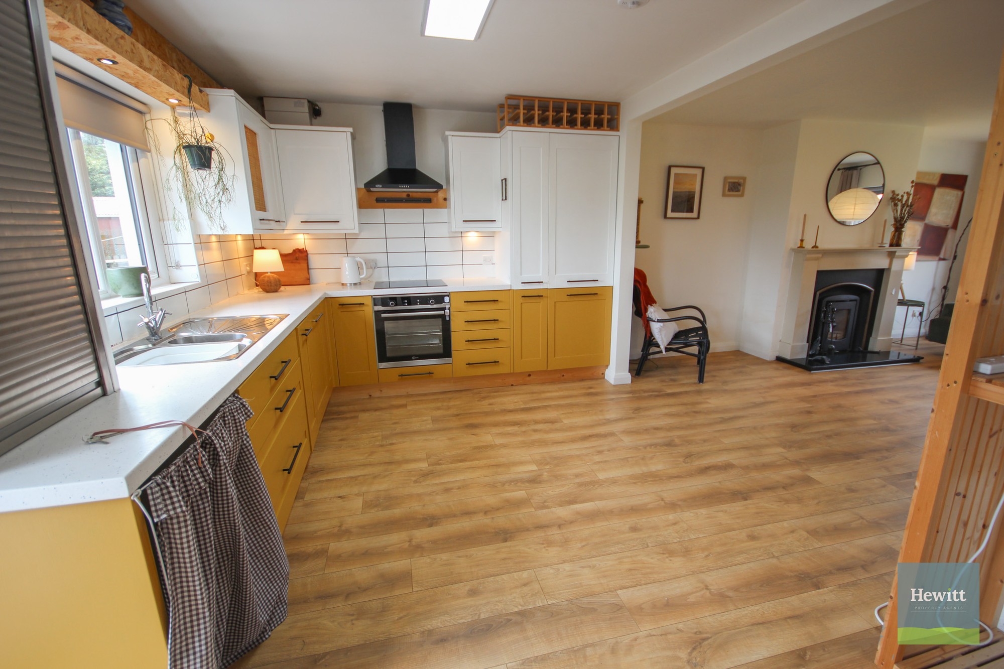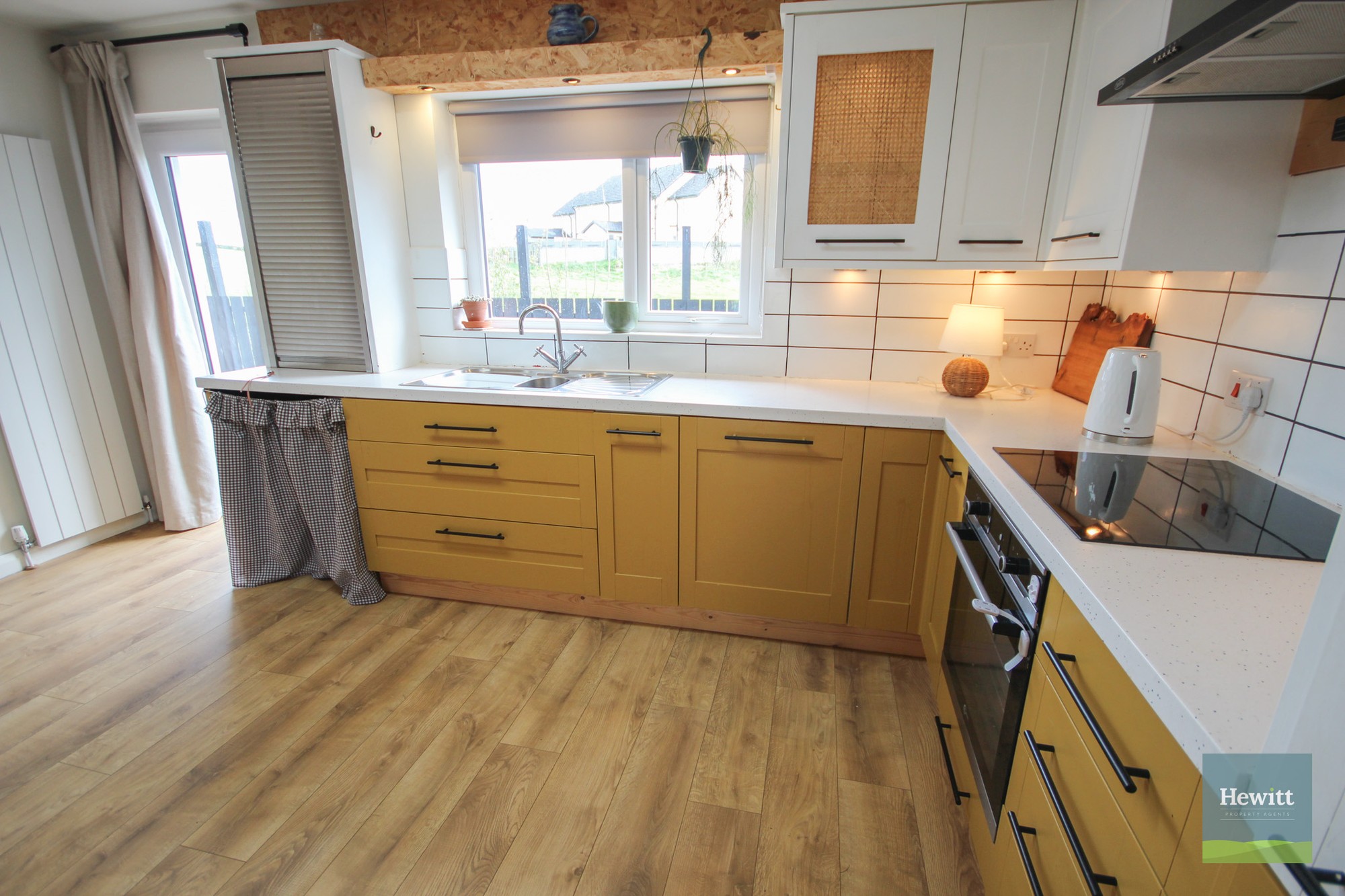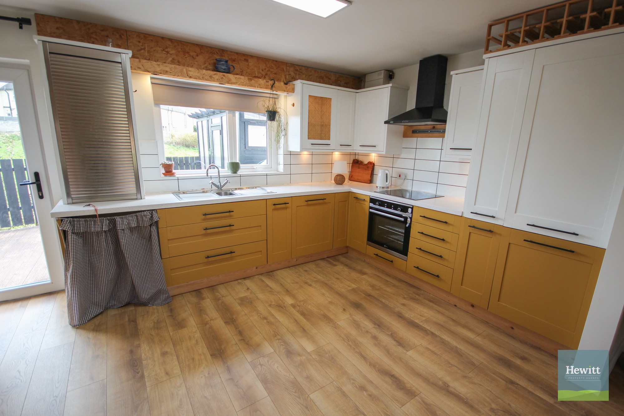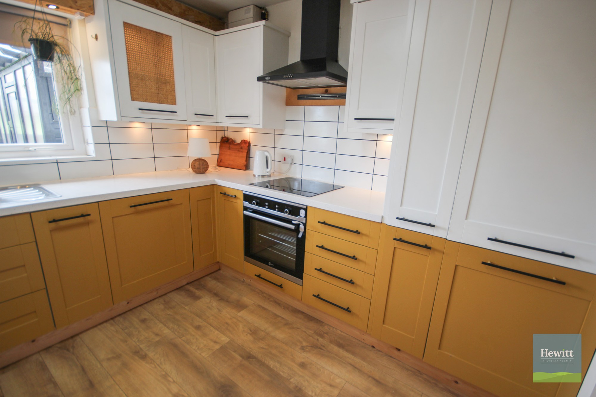 Wood effect laminate flooring. Range of fitted high and low units in a mustard & cream colours with black hardware. Electric hob and oven. Space for washing machine.