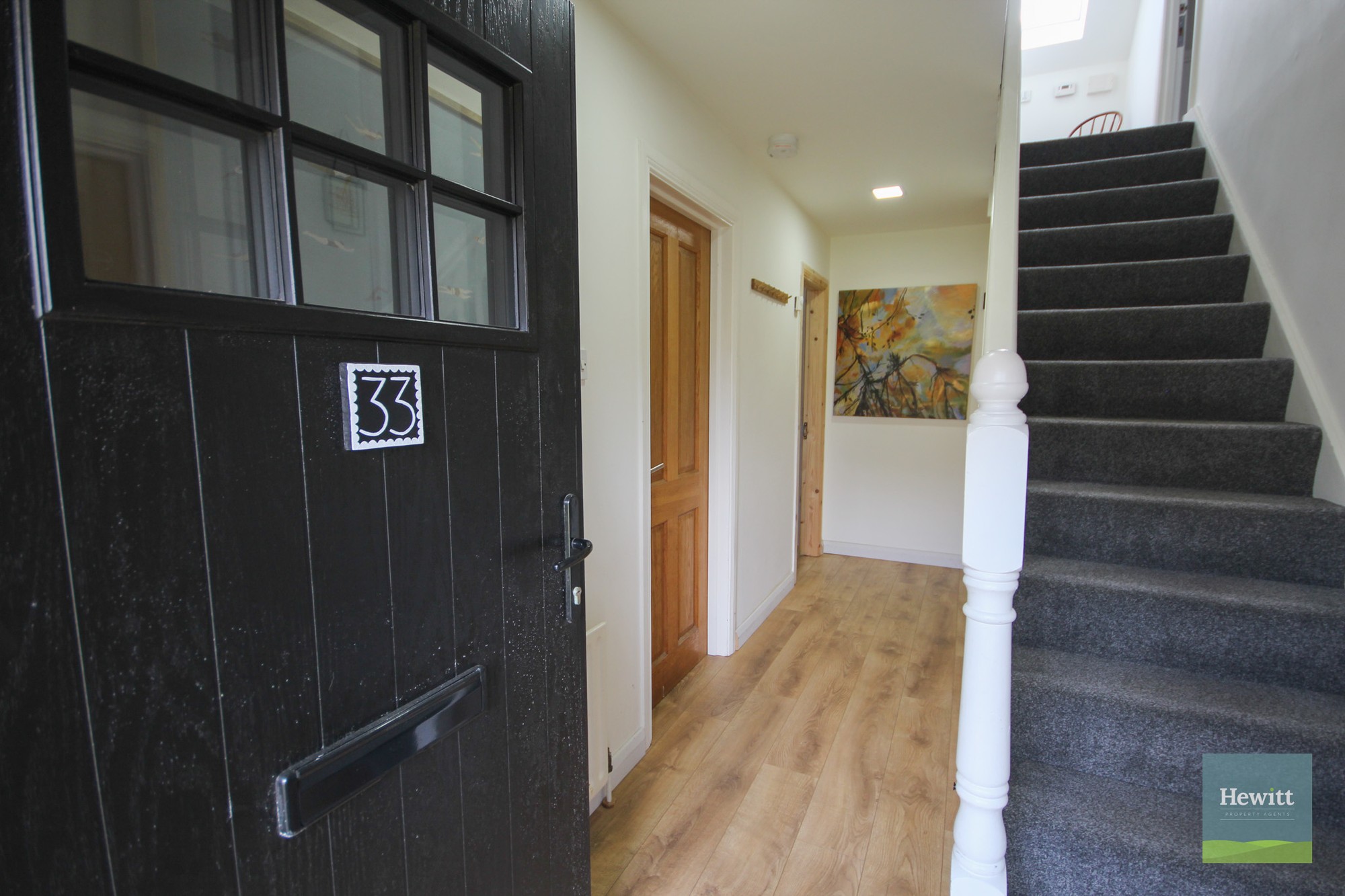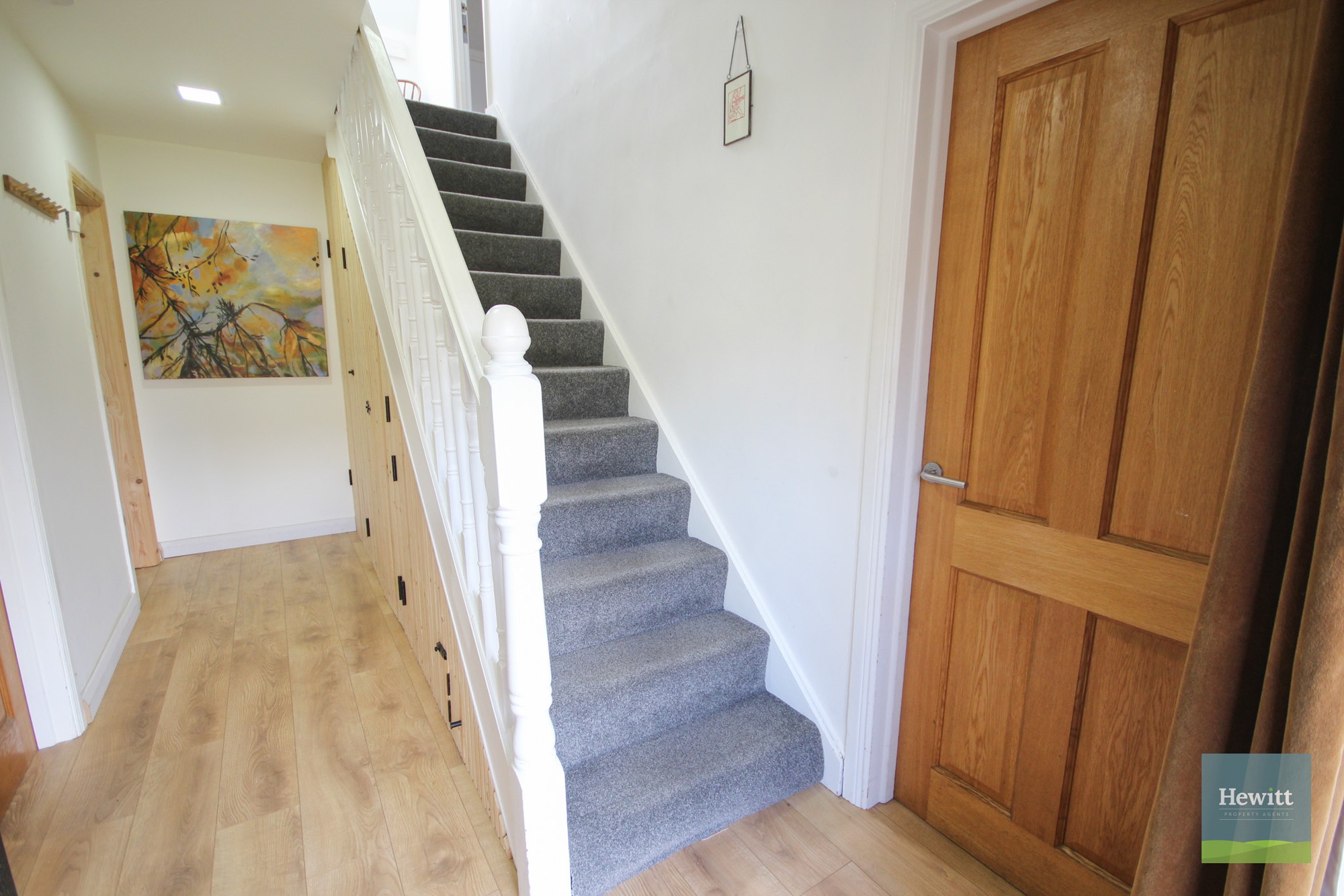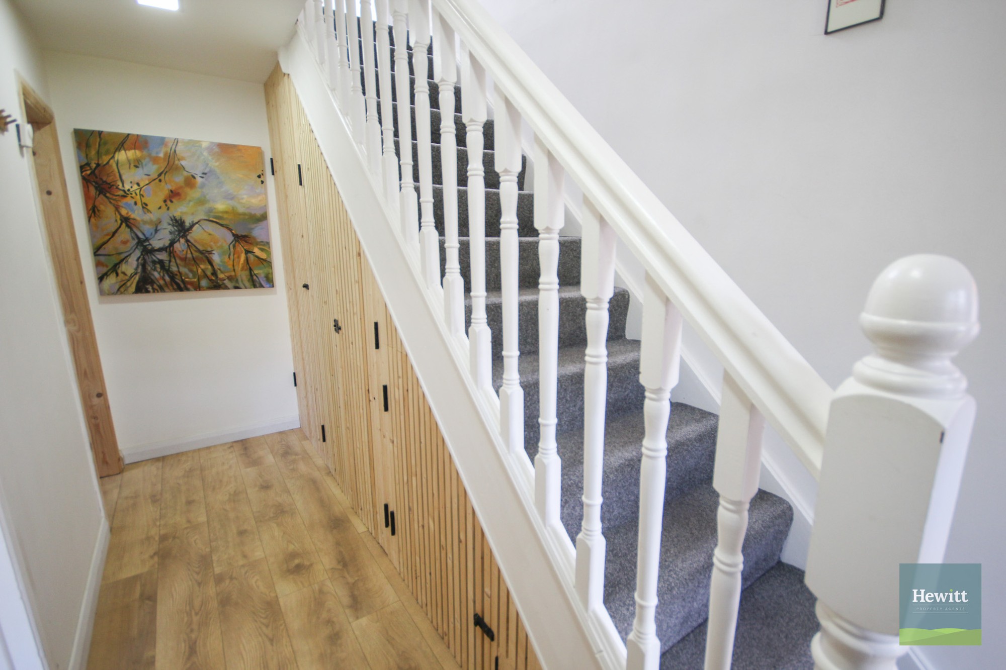 Wood effect laminate flooring. Access to under-the-stairs storage.