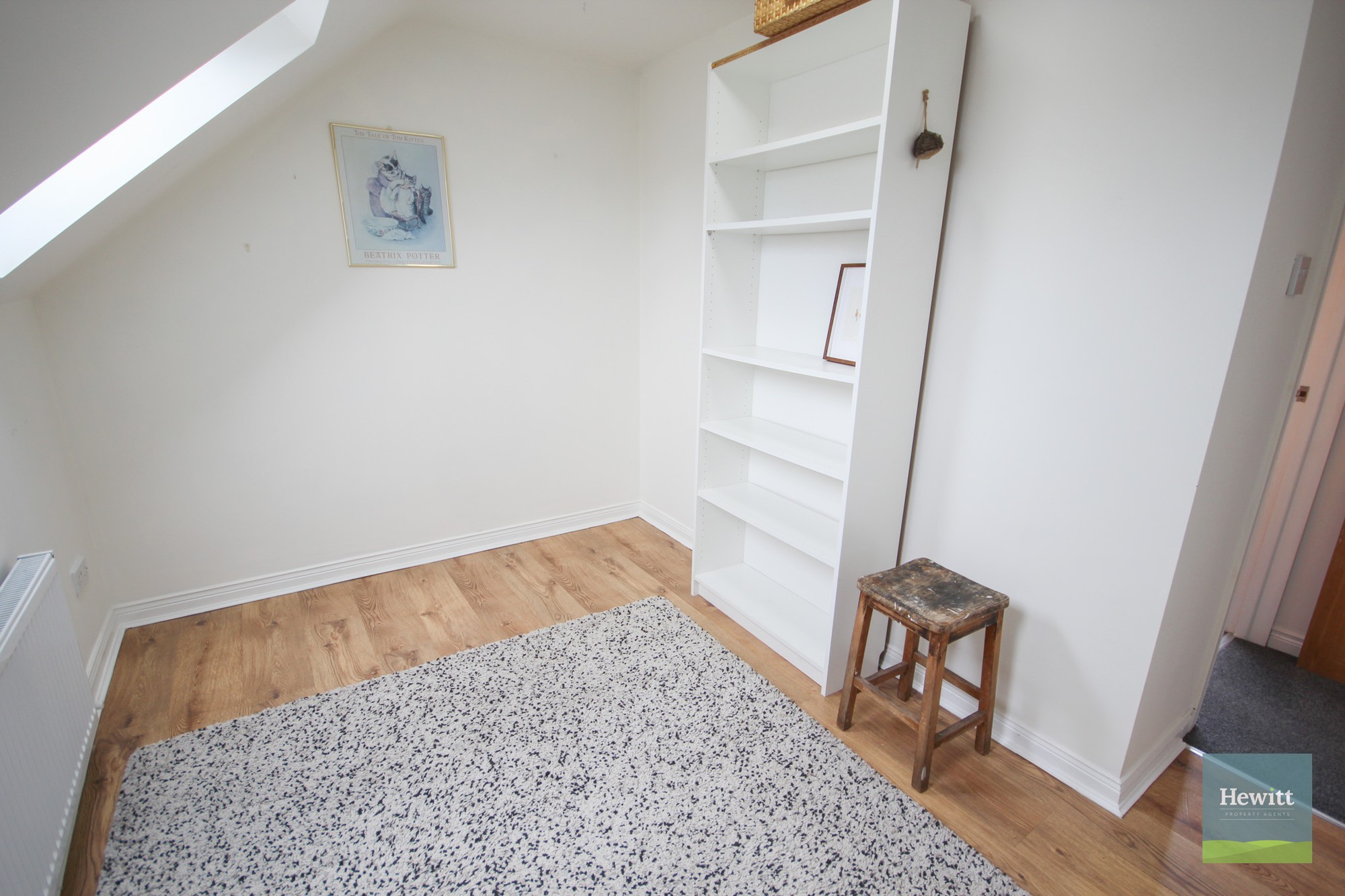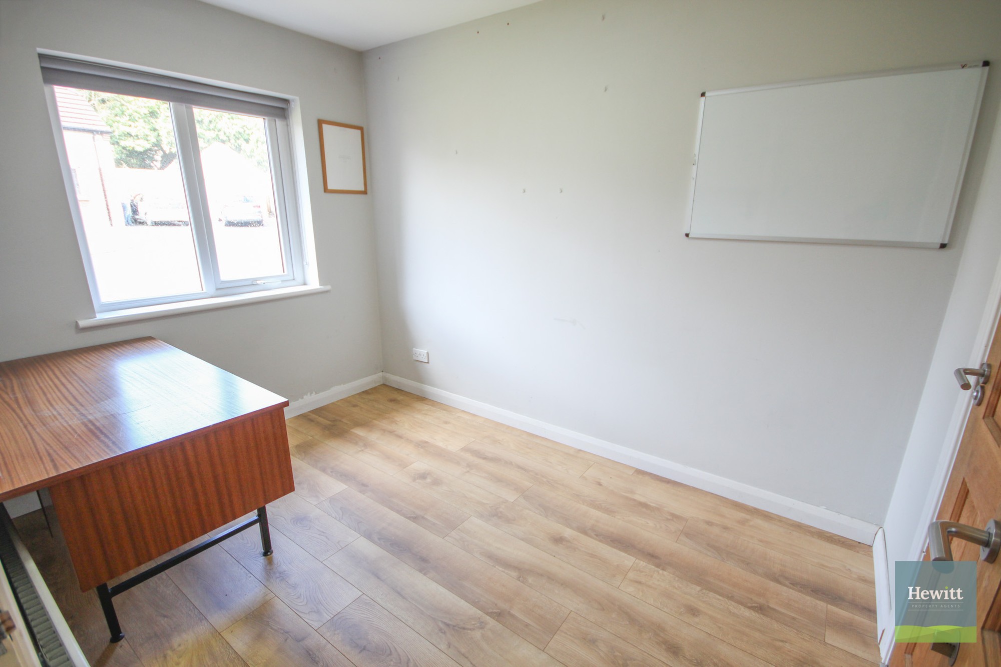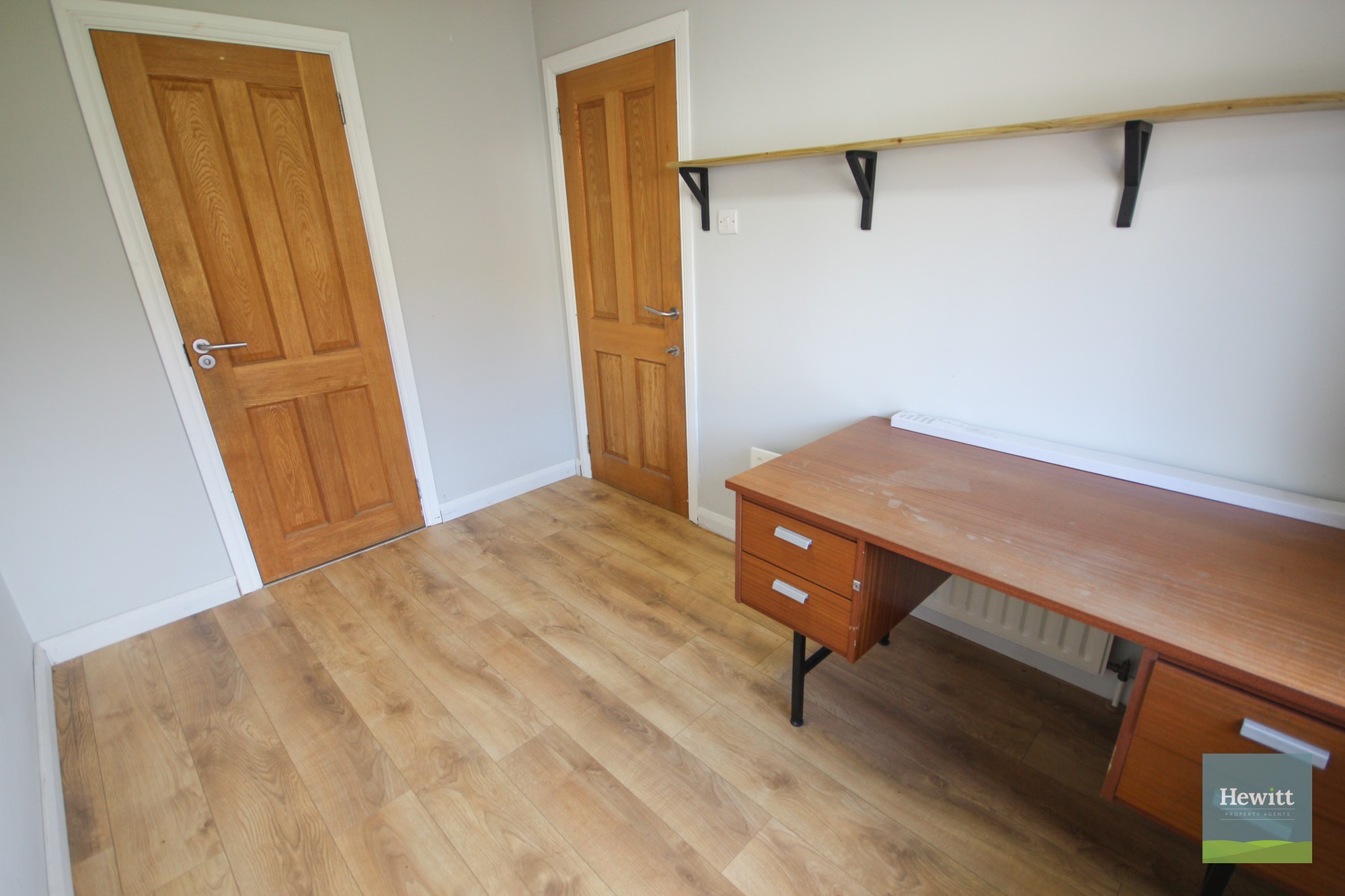 Wood effect laminate flooring. Access to under-the-stairs storage.