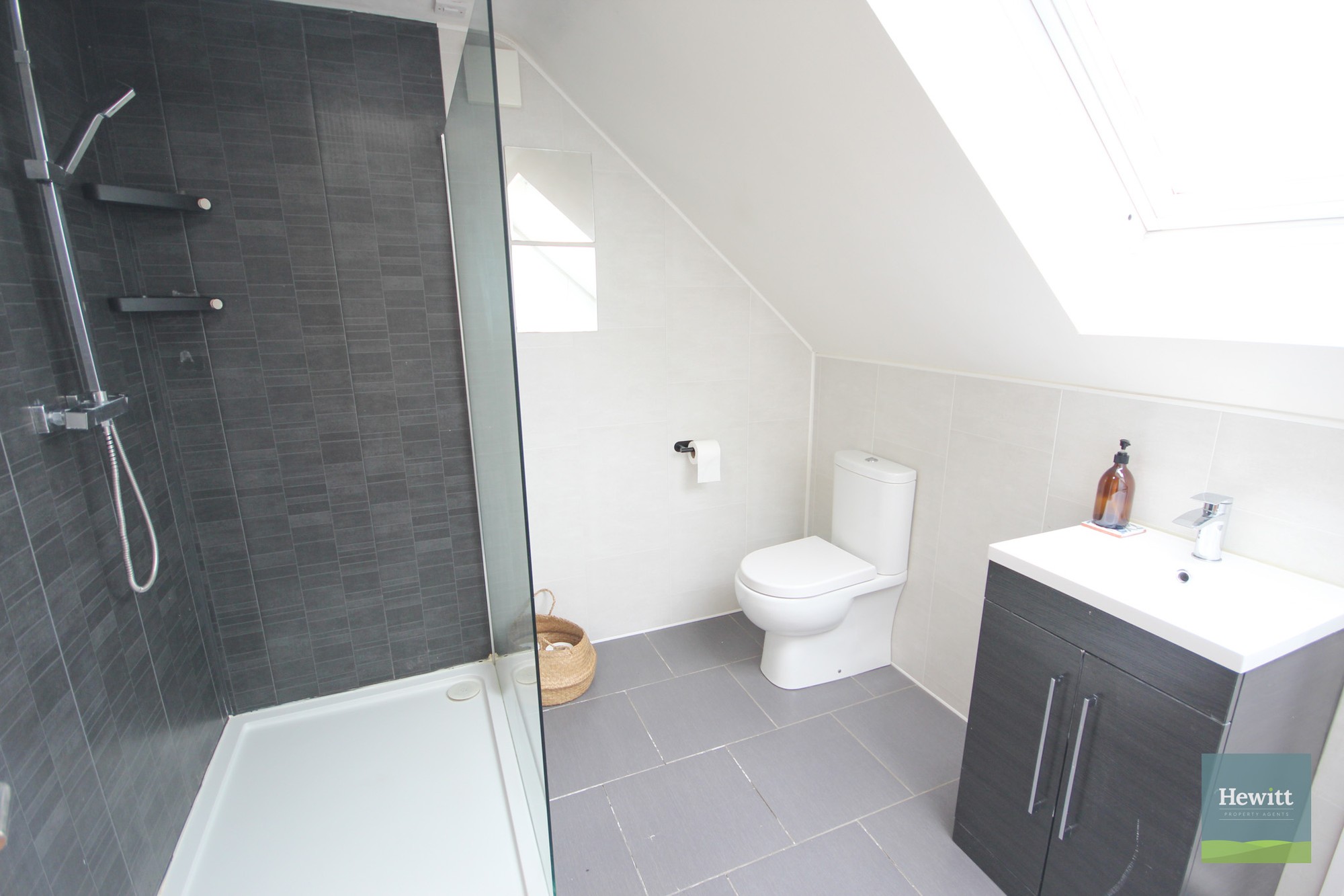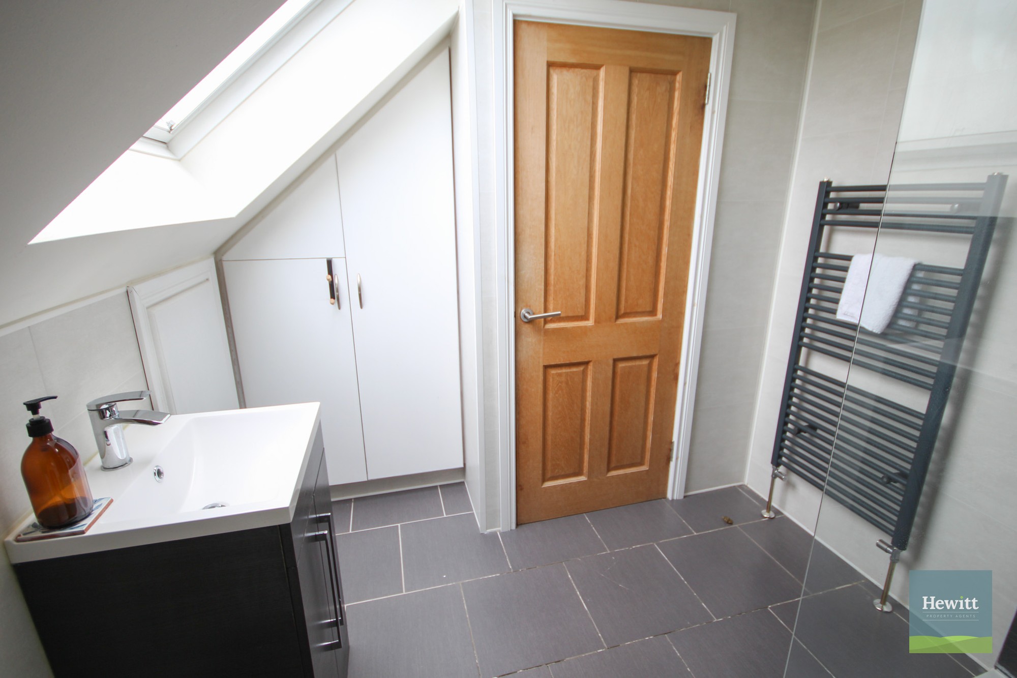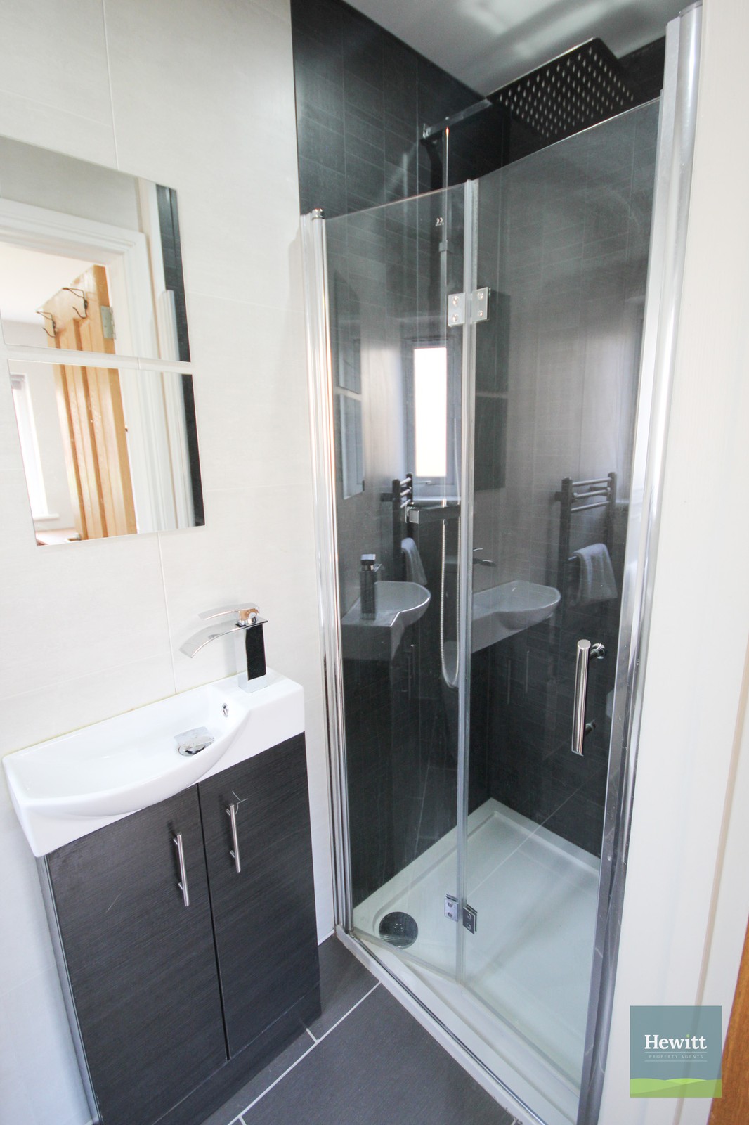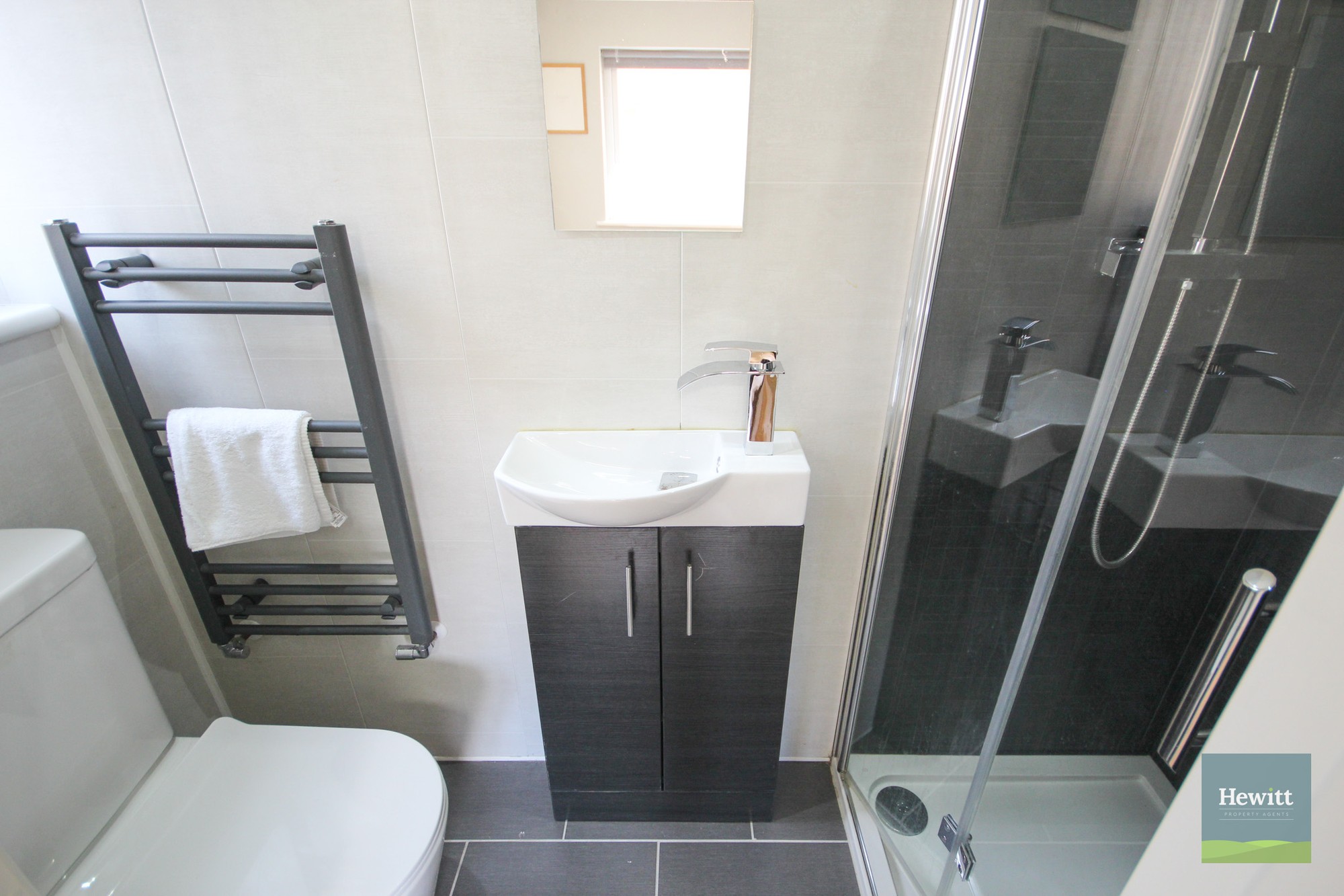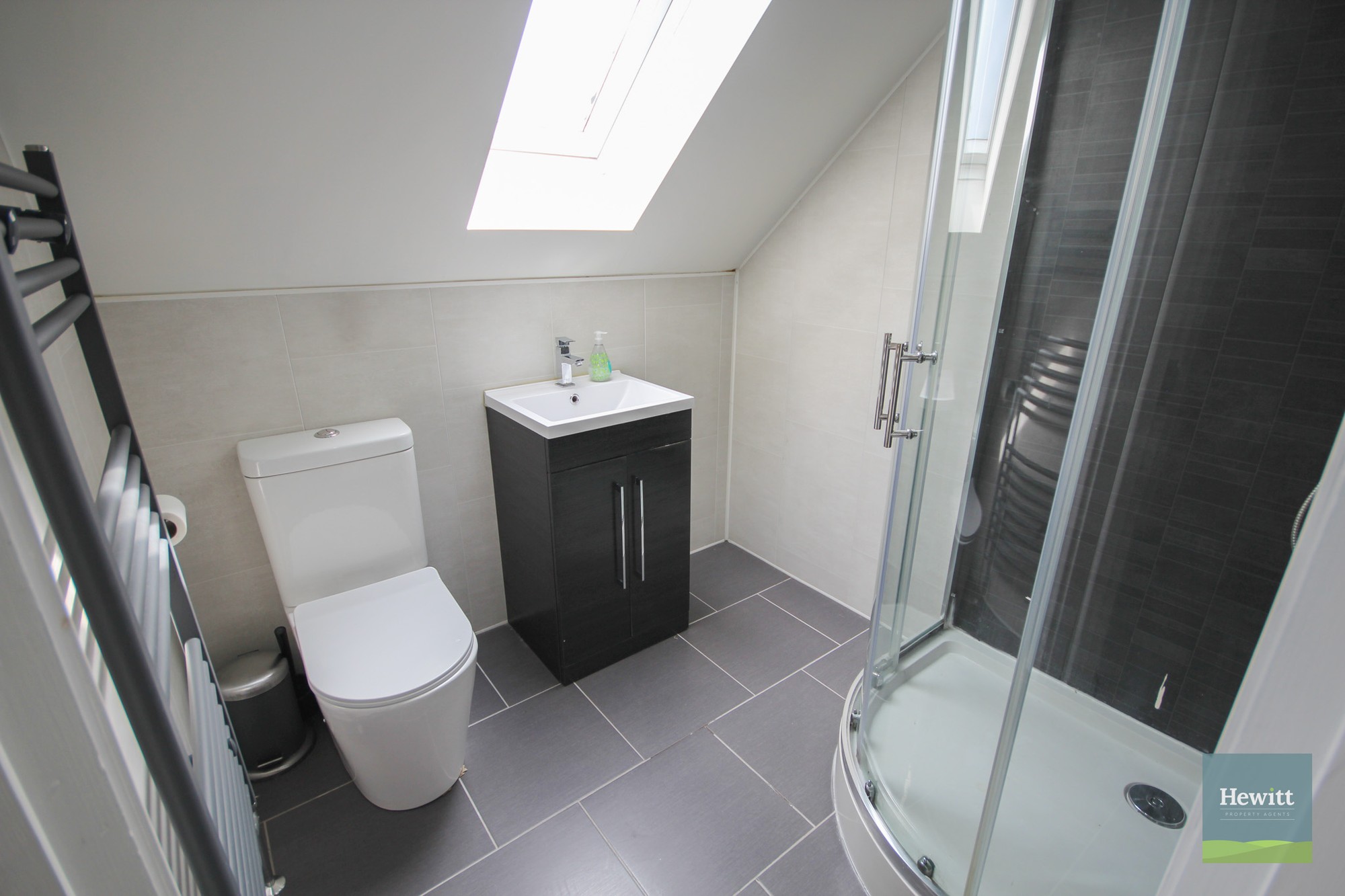 WC. Wash hand basin with built in storage. Shower. Heated towel rail.