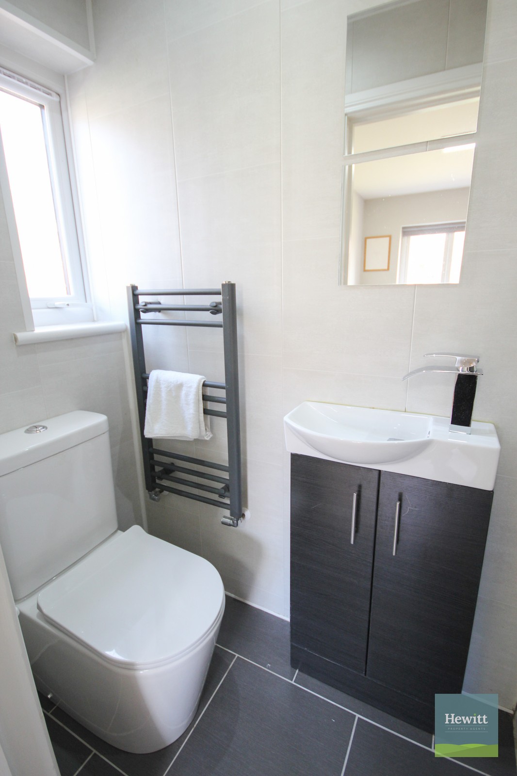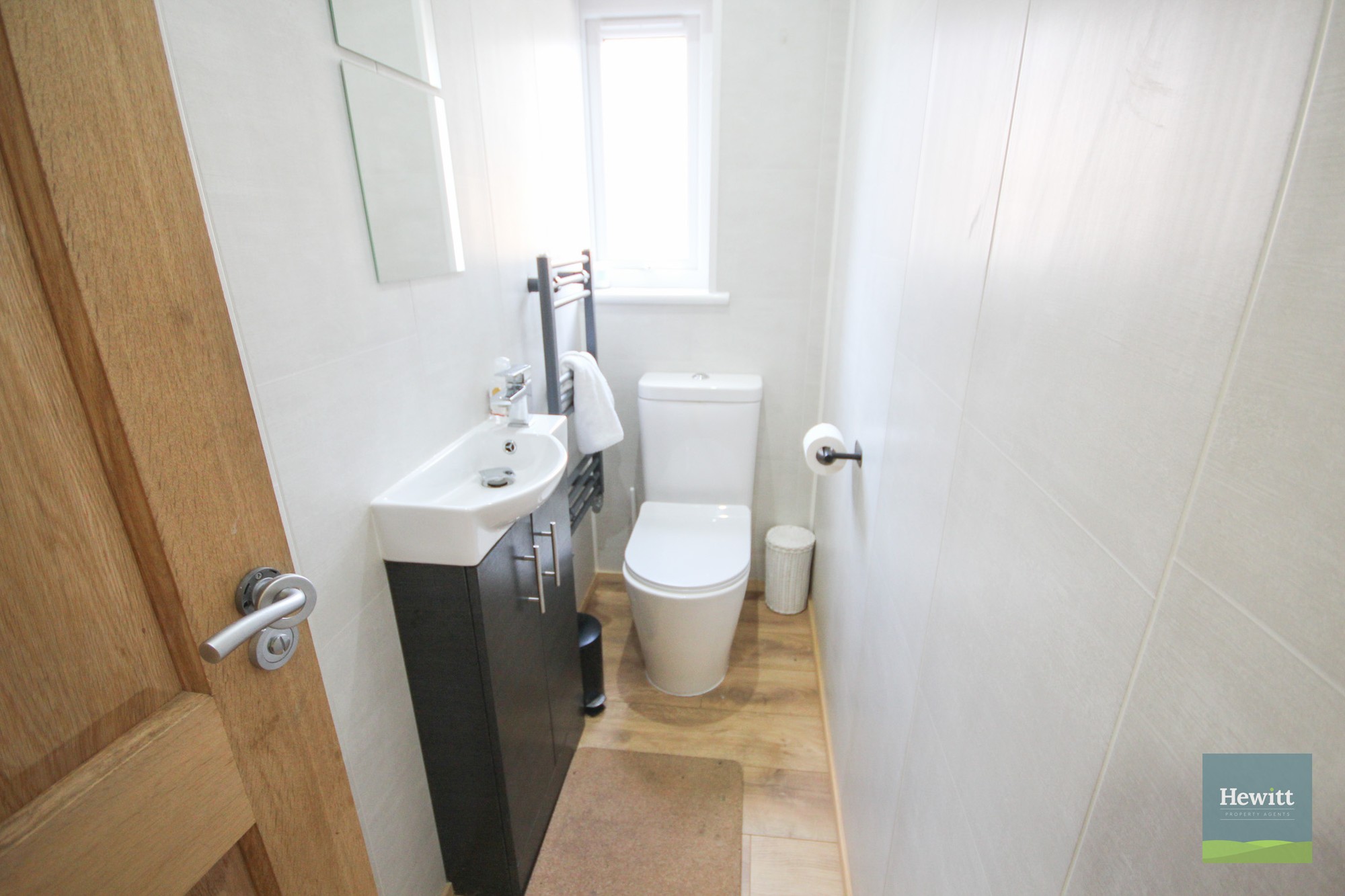 WC. Wash hand basin with built in storage. Heated towel rail.