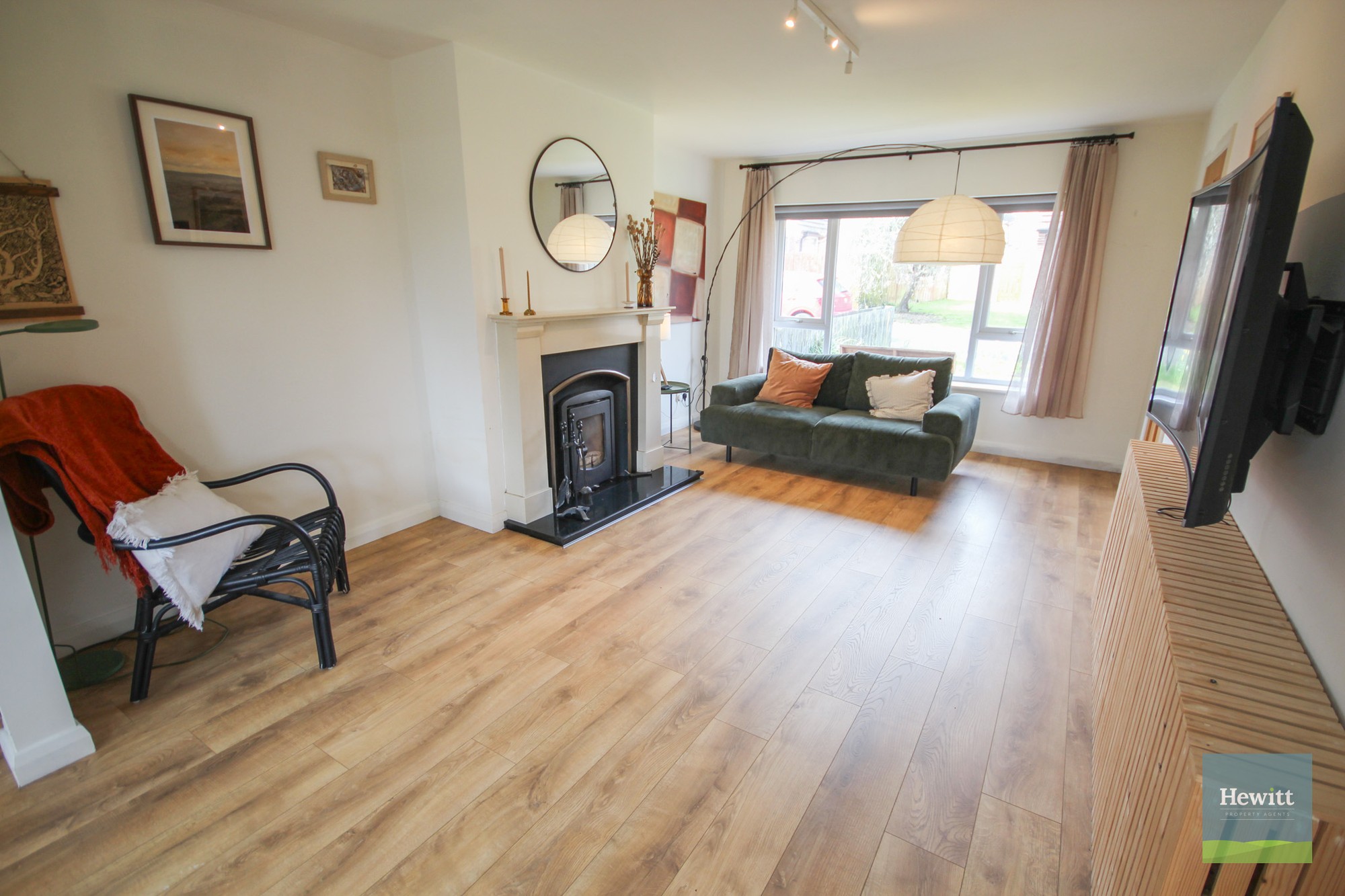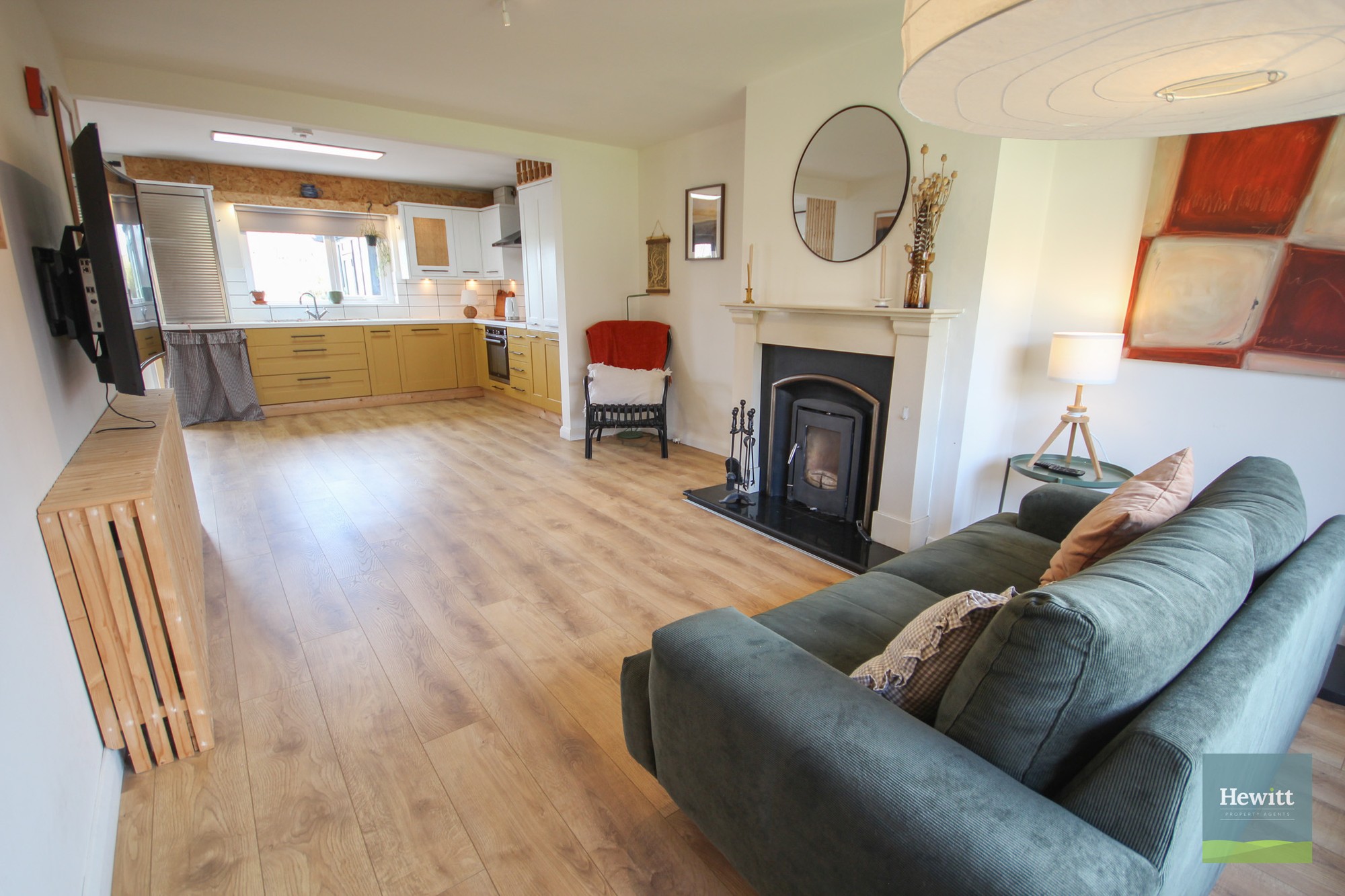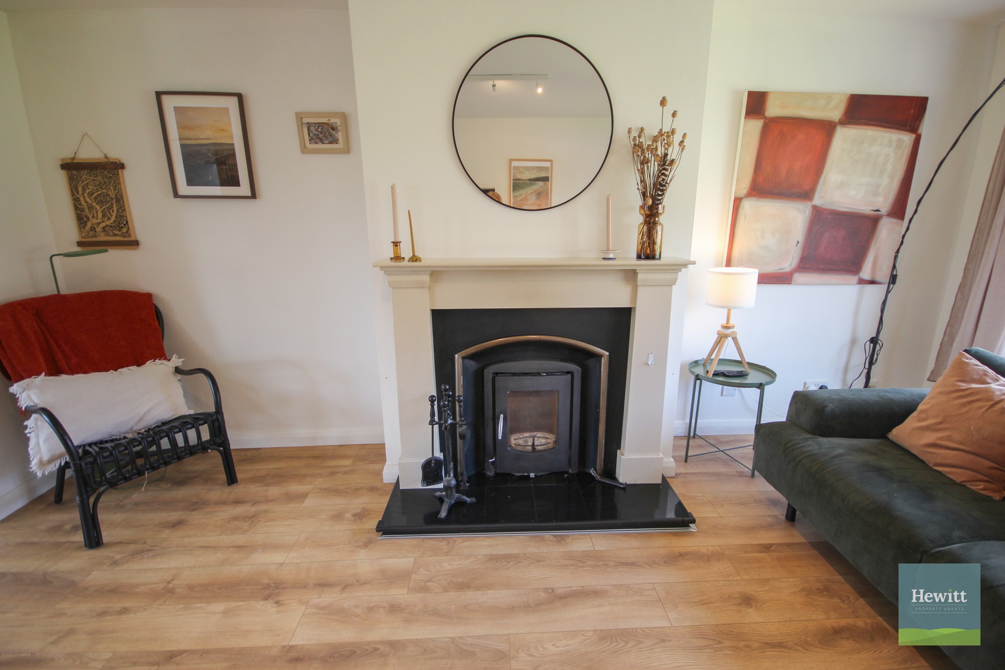 Wood effect laminate flooring. Fireplace with multifuel stove.