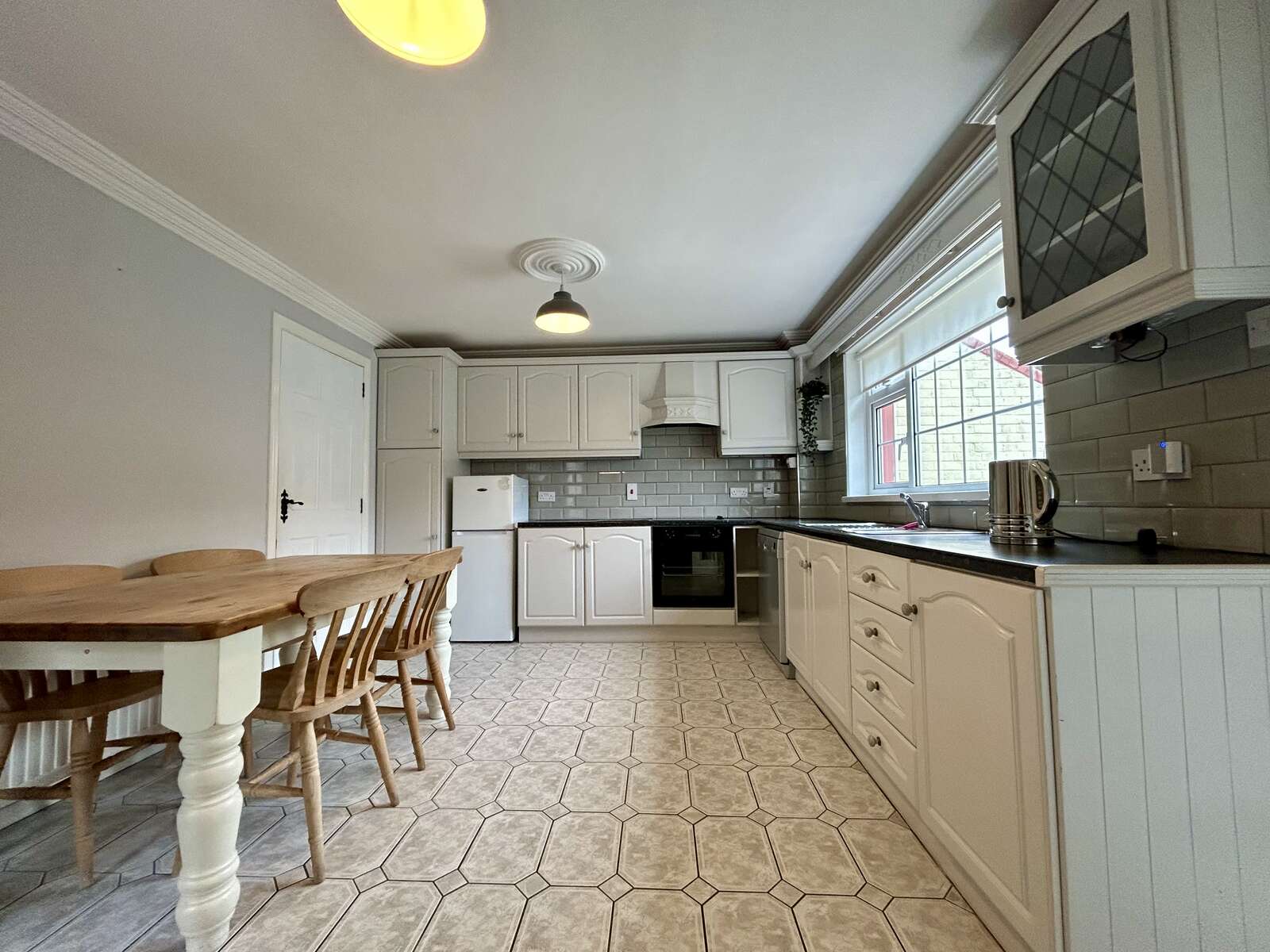 Tiled flooring, high and low level units, large pantry / laundry cupboard