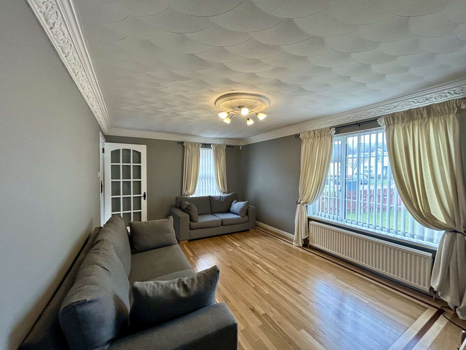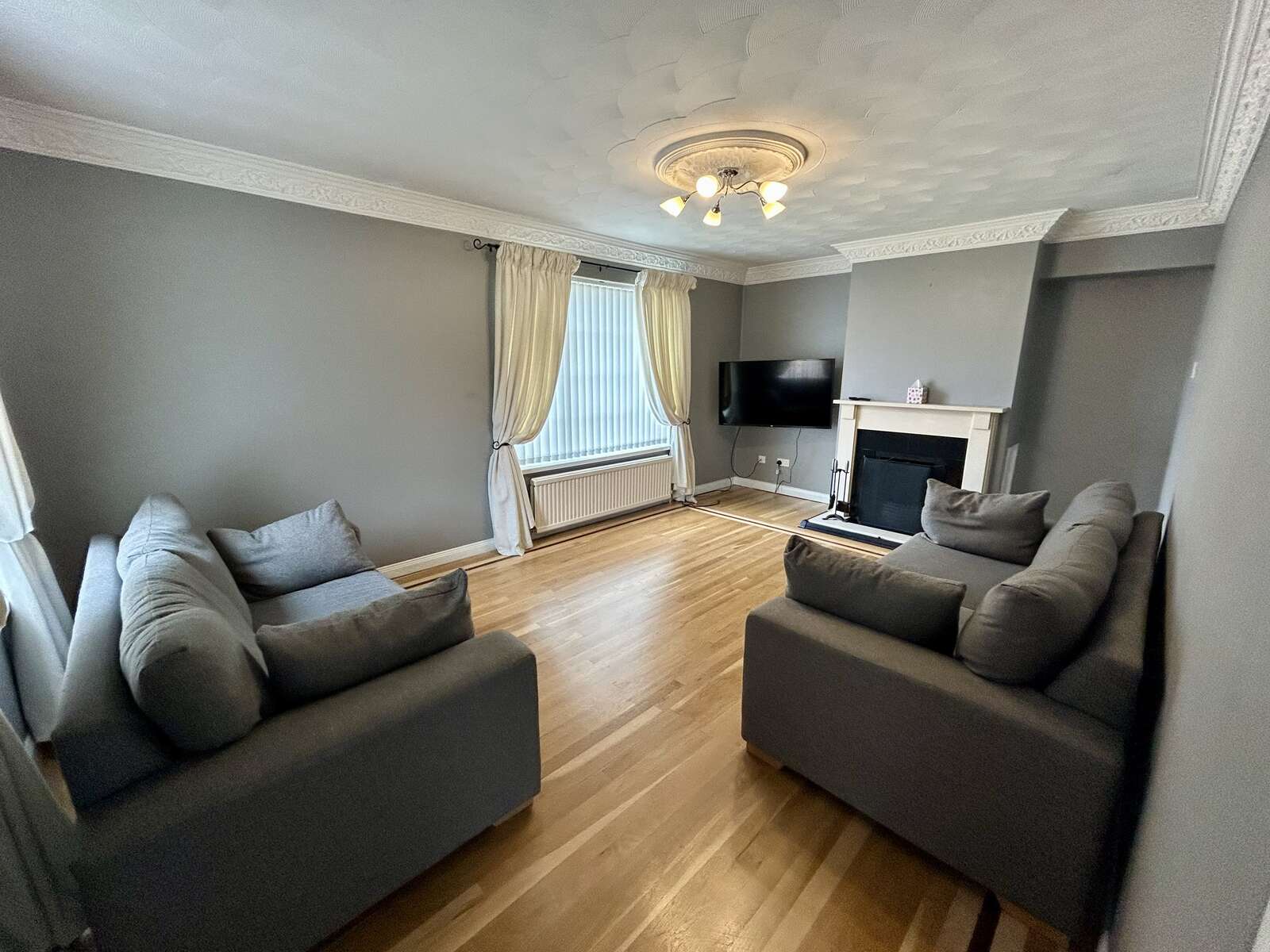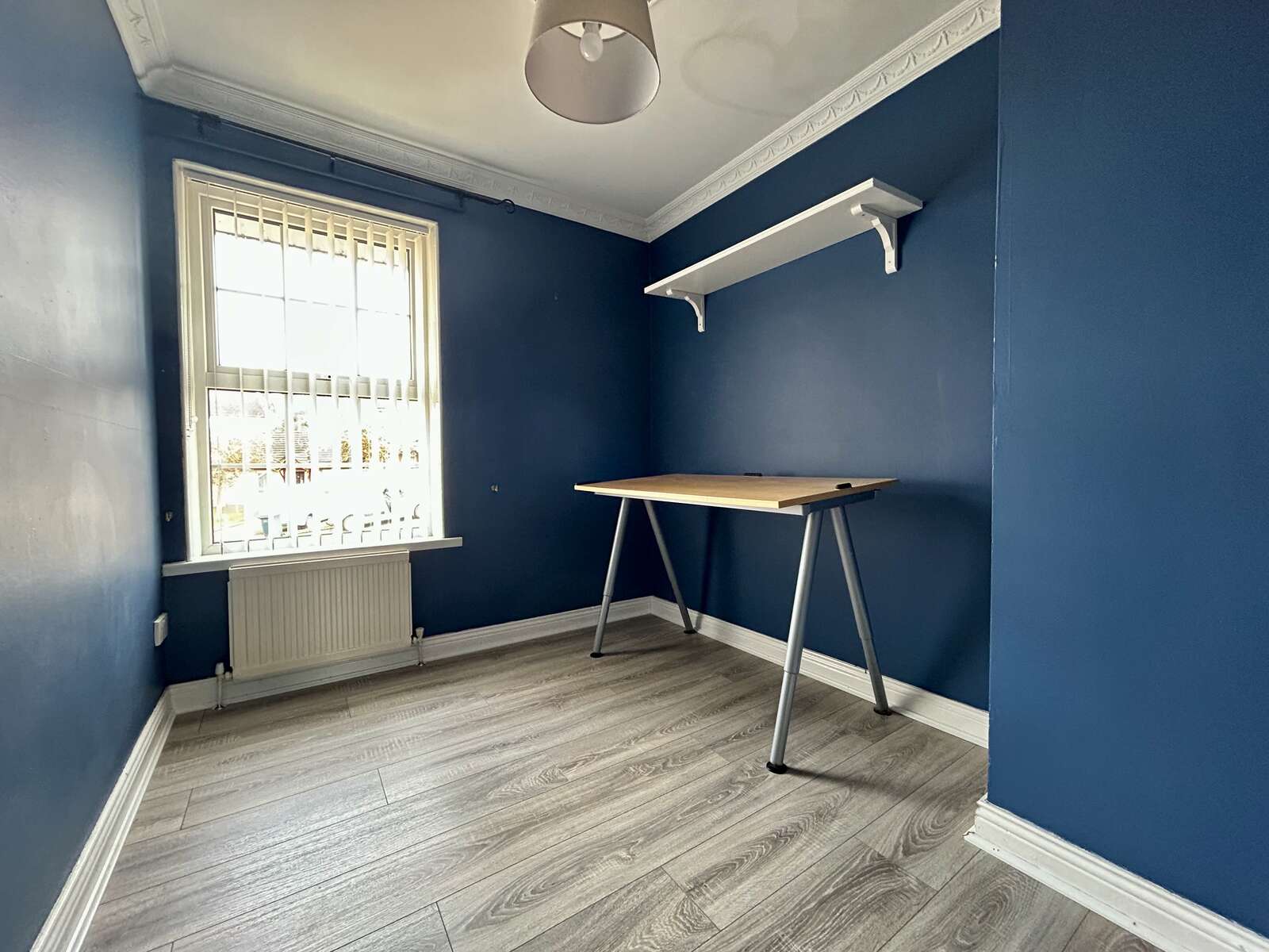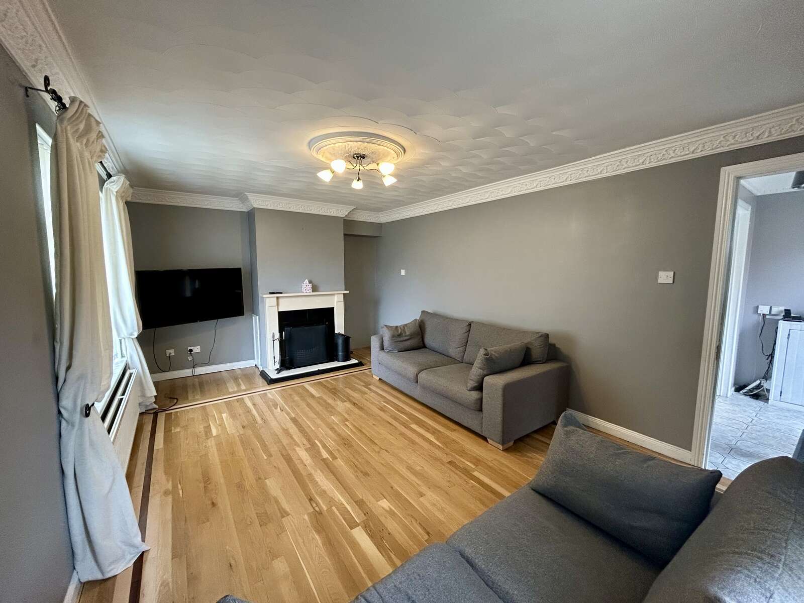 Solid wood flooring, feature cornice ceiling, fireplace