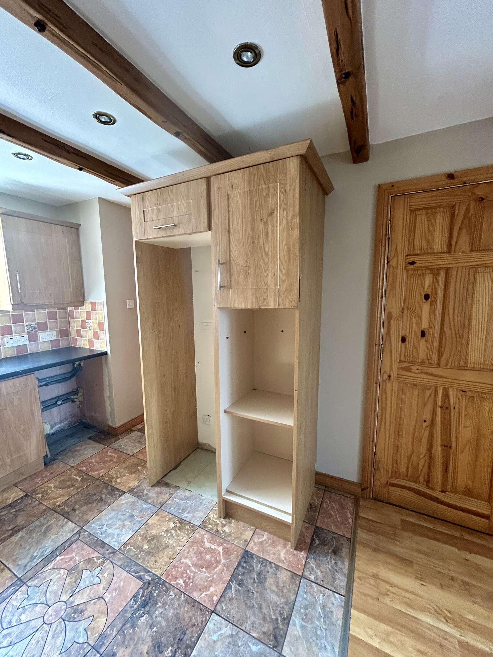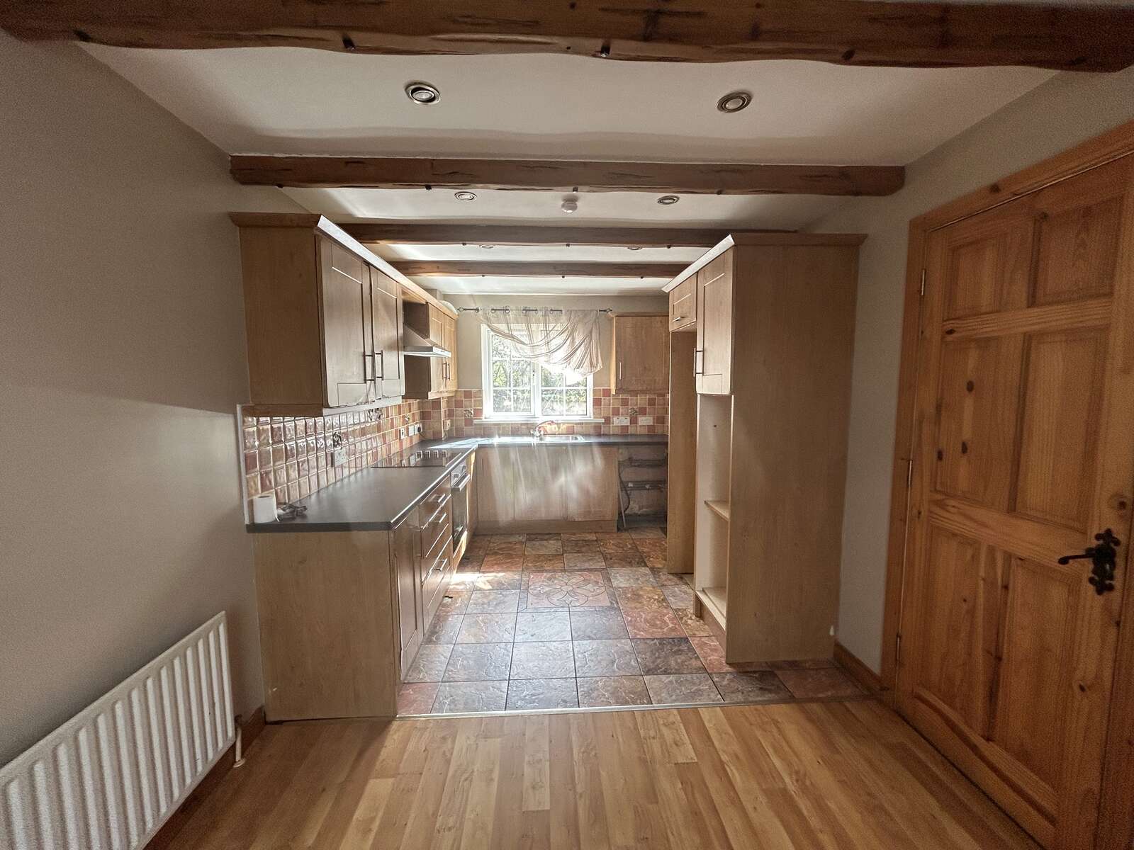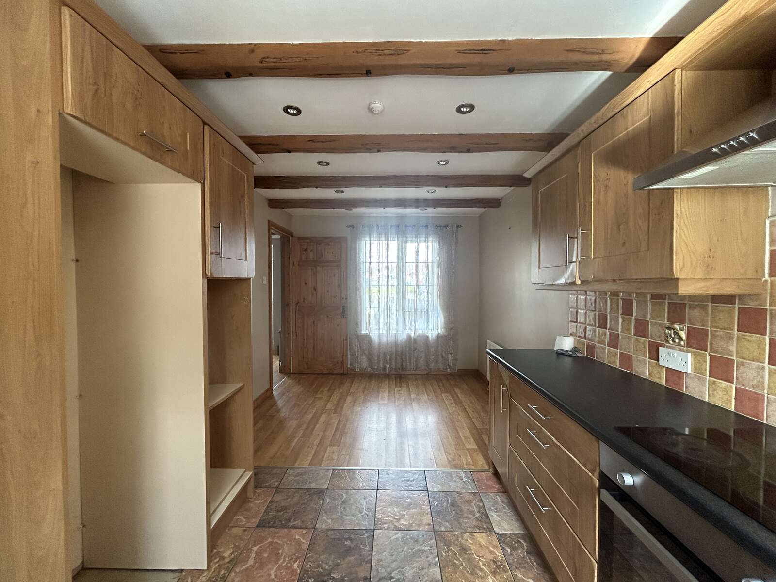 Tiled / laminate flooring, high and low level units, feature beam ceilings, pantry