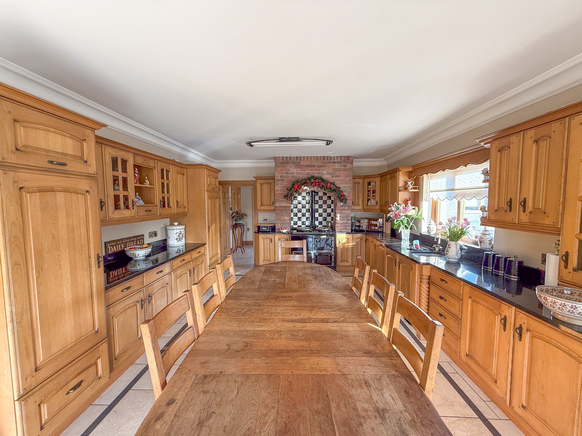 Kitchen with Living / Dining area 22’7” x 14’3” Beautiful character oak range of units with Aga oil fired cooker in brick surround, integrated dishwasher and fridge. Tiled floor and part tiled walls.