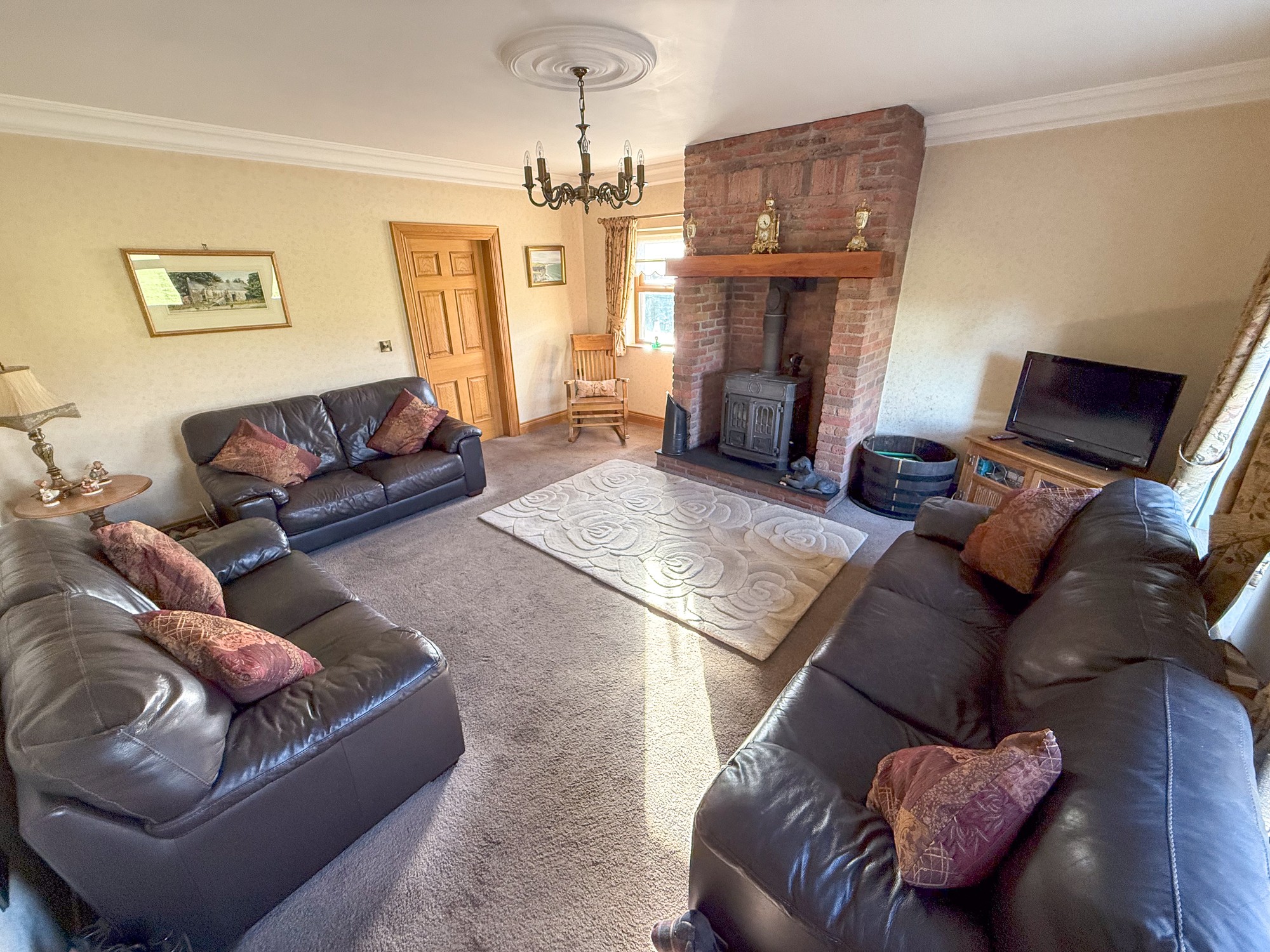 Internally, the home is beautifully appointed with a wealth of character features including oak finishes, ornate cornicing, and feature fireplaces. The ground floor boasts a grand entrance hall with sweeping oak staircase, elegant drawing room and living room—both with multi-fuel Charmwood stoves—alongside a stunning sun lounge with vaulted oak ceiling. The expansive open plan kitchen/living/dining space is the heart of the home, featuring a traditional Aga oil-fired cooker set within a brick surround and a range of bespoke oak units. A fully fitted utility room and rear porch with WC complete the ground floor.