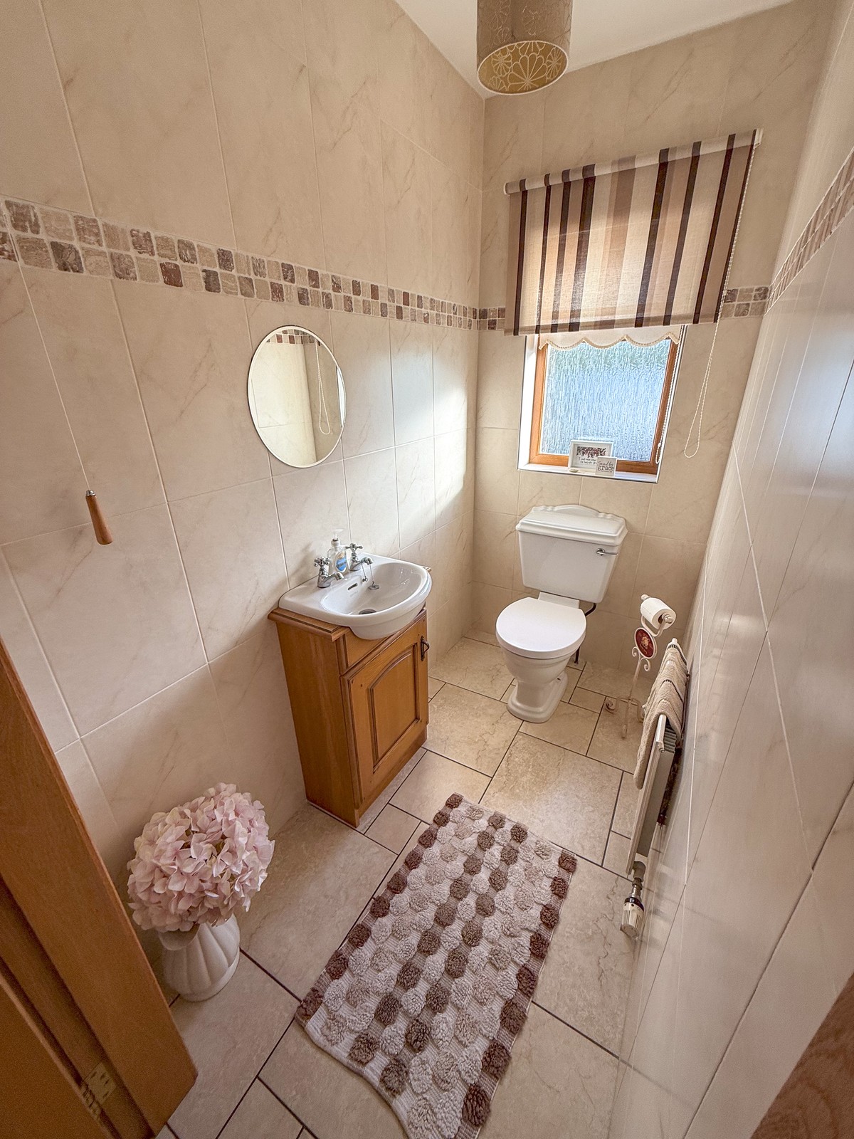 Rear porch – adjoining whb/Wc compartment with tiled flood and part tiled walls.