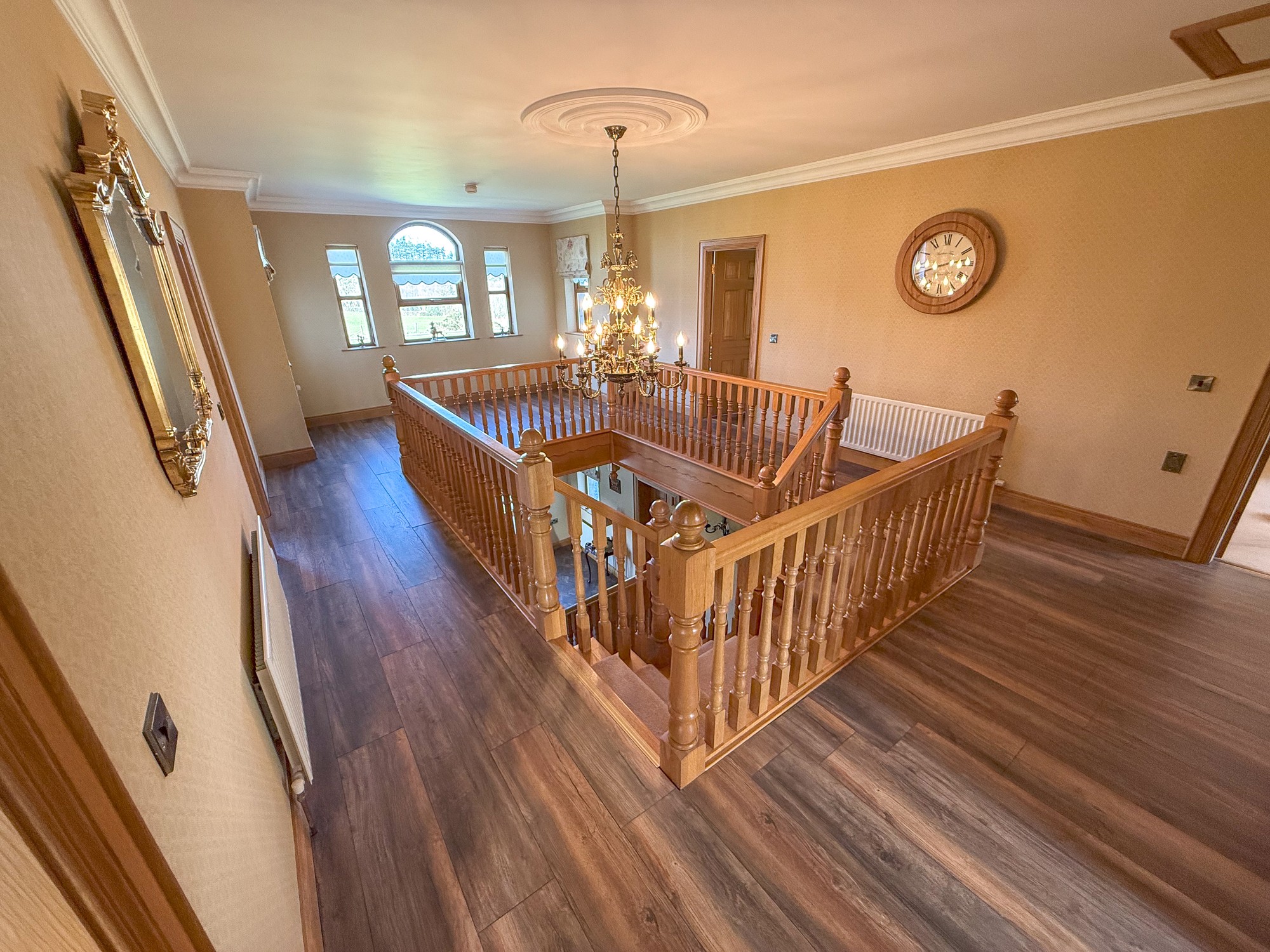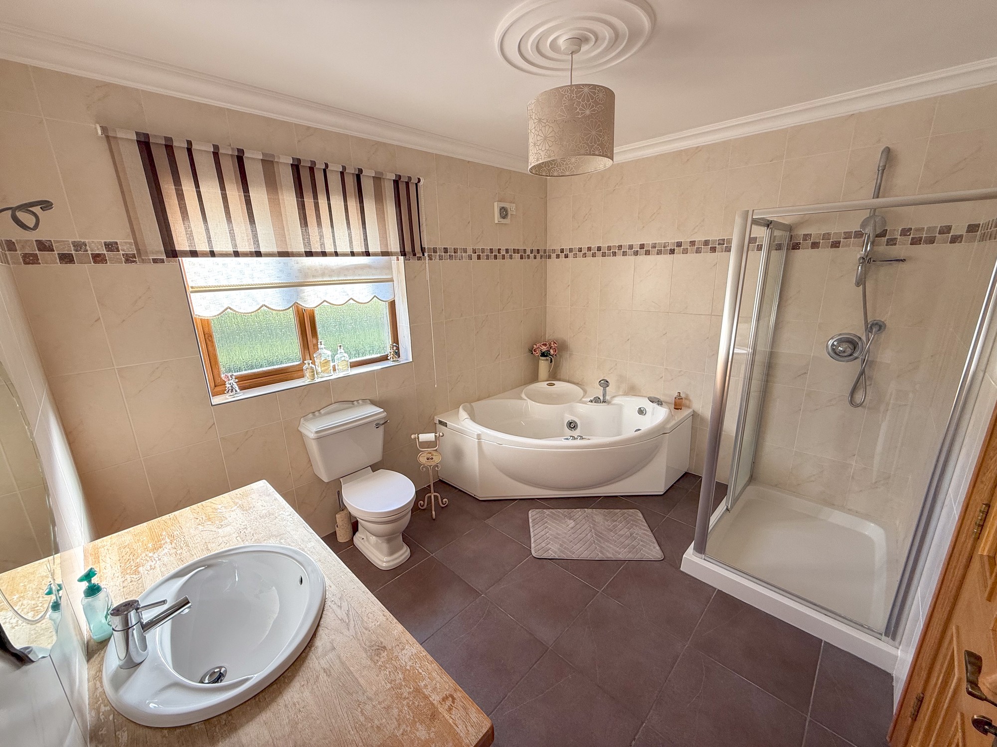 Upstairs, the property offers four generously sized bedrooms, three with walk-in wardrobes. The master bedroom benefits from a walk-in wardrobe and ensuite shower room. A spacious family bathroom with whirlpool bath and separate shower completes the first floor.