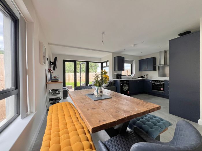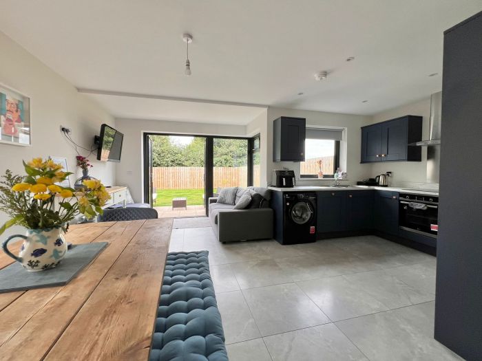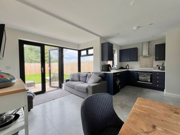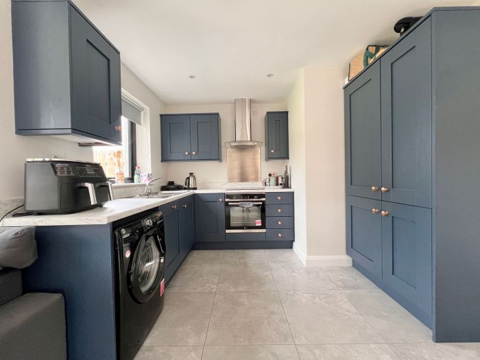 With eye & low level units, stainless steel sink and drainer unit, electric hob & oven, stainless steel extractor fan, integrated dishwasher, integrated fridge freezer, plumbed for washing machine, dining & living area, tiled floor, patio doors to rear garden.