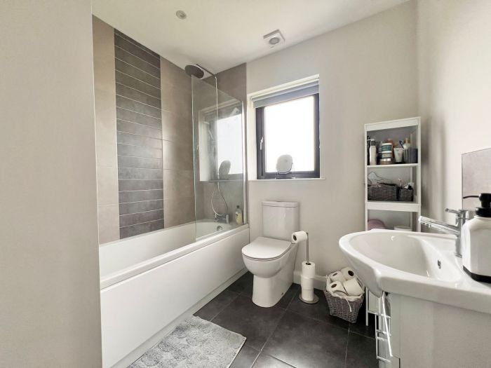 With wc, whb, bath, shower over bath with rainfall shower, chrome towel rail, recessed lights, walls part tiled, floor fully tiled.