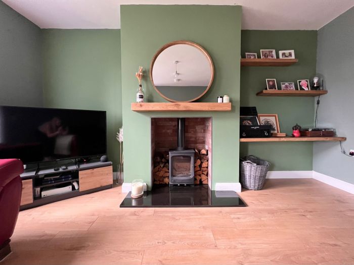 With feature wood burning stove, granite hearth, laminate wood floor, tv point.