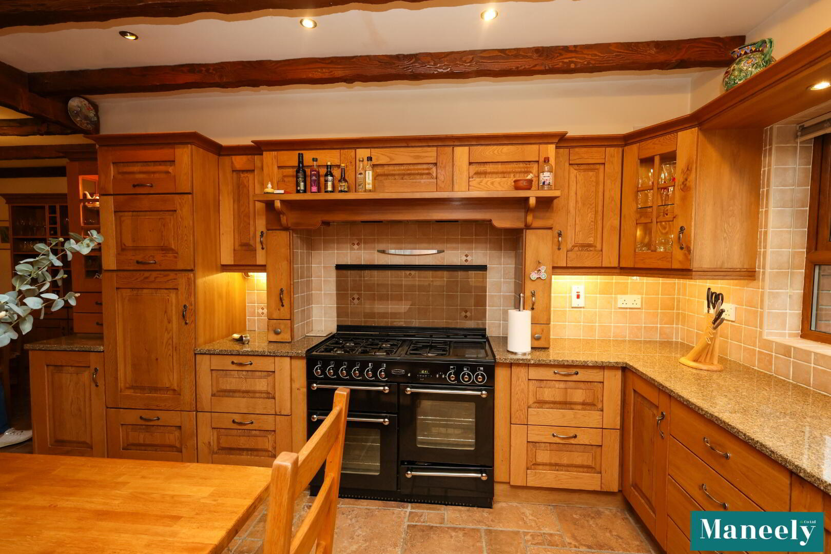 Solid oak high and low-level units, granite worktops, built-in deep fat fryer and dishwasher, wooden wall panelling and tiled flooring.