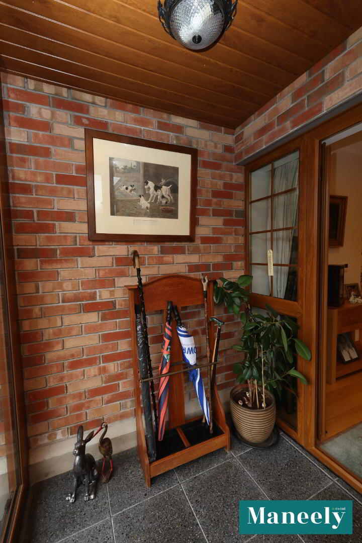 PVC front door with side glazing, recessed spot lighting, wooden flooring, stained-glass light well, decorative cornicing, hot press and two storage cupboards.