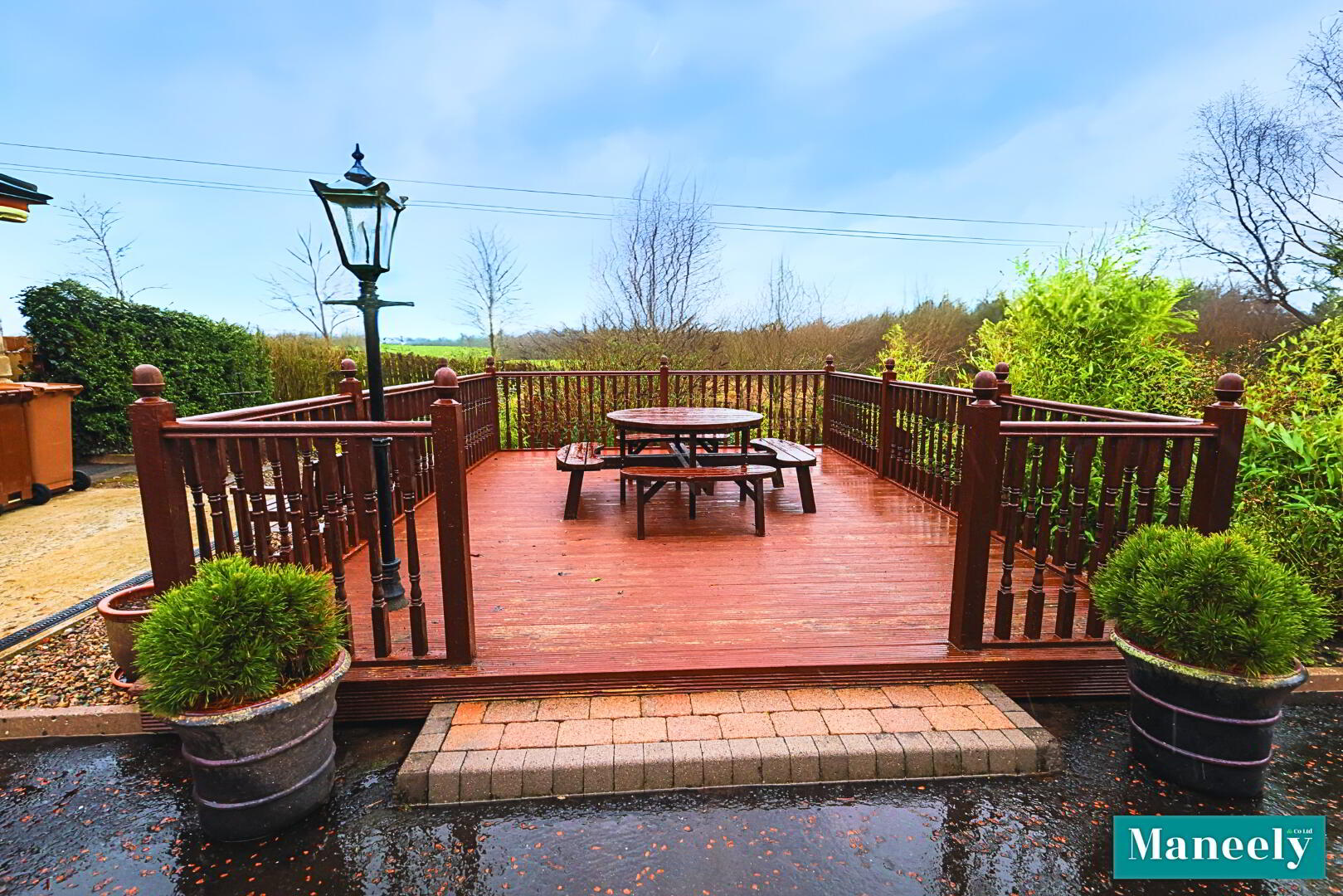 - Raised wooden decking area with outdoor seating