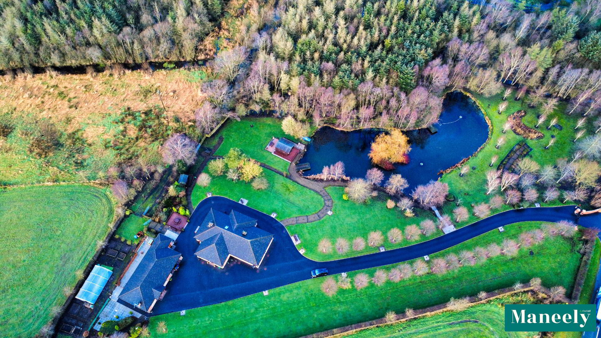 Set on an exceptional 6.5-acre private estate, this impressive residence, built in 2006, offers luxury living with outstanding lifestyle features. The main dwelling boasts elegant proportions, high standard of finish and attractive features throughout. Highlights include a grand living room, a stunning open-plan kitchen, living and dining space with oak units, granite worktops and exposed beams, and a superb master suite complete with dressing room, en suite, jacuzzi bath and private sauna. Two further bedrooms and a beautifully appointed family bathroom complete the home. A fully self-contained two bedroom, two bathroom annex provides excellent accommodation for guests or extended family, while additional amenities include a garage, external utility and WC, and a charming fishing lodge overlooking the private lake. The grounds are truly remarkable, featuring landscaped gardens, a lake with fishing piers and island, woodland walk, field, polytunnel and vegetable patch. Gated access, sweeping driveway and backup generator complete this rare and exceptional offering. Situated at 203 Ballynakilly Road, Coalisland, the property enjoys a peaceful yet accessible rural setting, offering exceptional privacy while remaining convenient to local amenities and road links. Junction 14 of the M1 Motorway is just one minute away which offers excellent access to Belfast, Omagh, Enniskillen and other large towns via the A4 & A5 main roads. Homes of this scale, quality and setting, combined with such extensive grounds and lifestyle features, are exceptionally rare, and opportunities to acquire a residence of this calibre come to the market only on the most infrequent occasions.