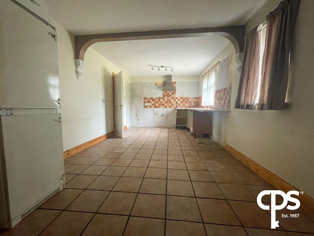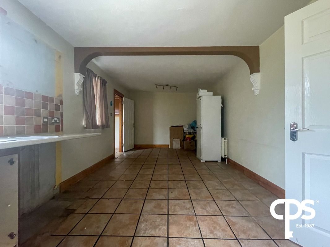 Spacious kitchen/diner with tiled flooring and fitted sink. No units currently remain, offering a blank canvas for a fully customised modern kitchen.