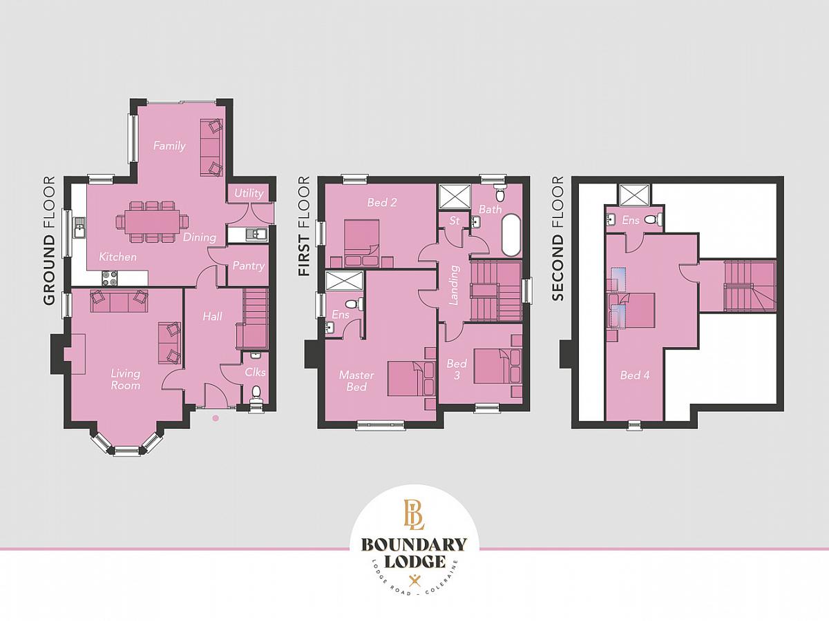 Travelling through Coleraine town centre past the leisure centre turn left at the end of the road and go past the police station on the right-hand side. Boundary lodge is 100m up the road on the left-hand side before Lodge Road roundabout.
