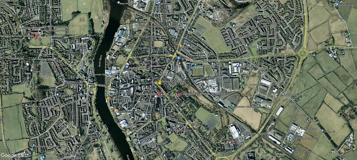 As you follow the one way system through Coleraine, at the top of Union Street turn right onto Railway Road, proceed past the leisure centre and at the end of the road turn left onto Kingsgate Street (Lower Lodge Road). Willis McCloskey's will be located immediately on your left, before terrace houses and fire station.