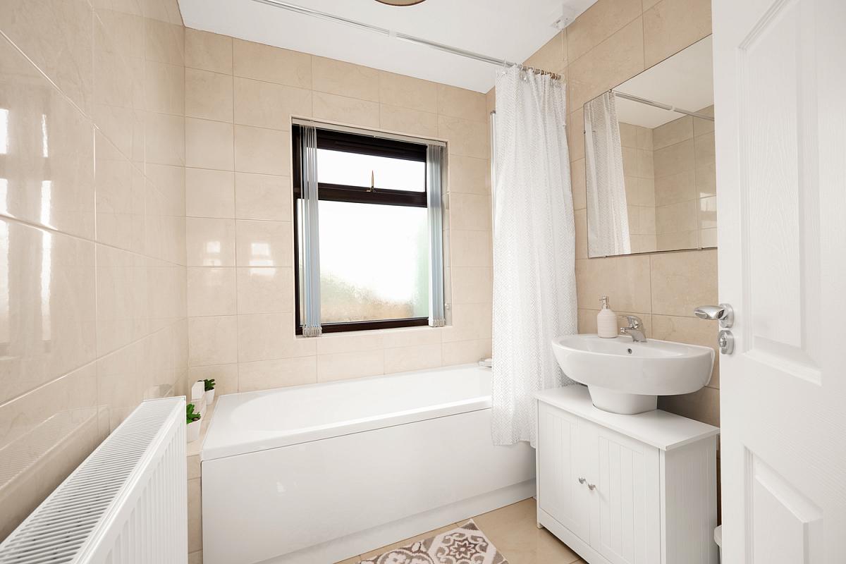 With white suite comprising w.c., wash hand basin, electric shower over bath, fully tiled walls, extractor fan and tiled floor.