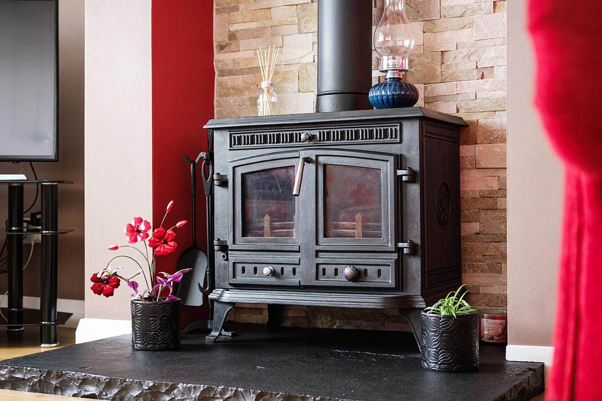 With log burning stove with brick recess, slate hearth and pine mantle, laminate wood floor and coving.