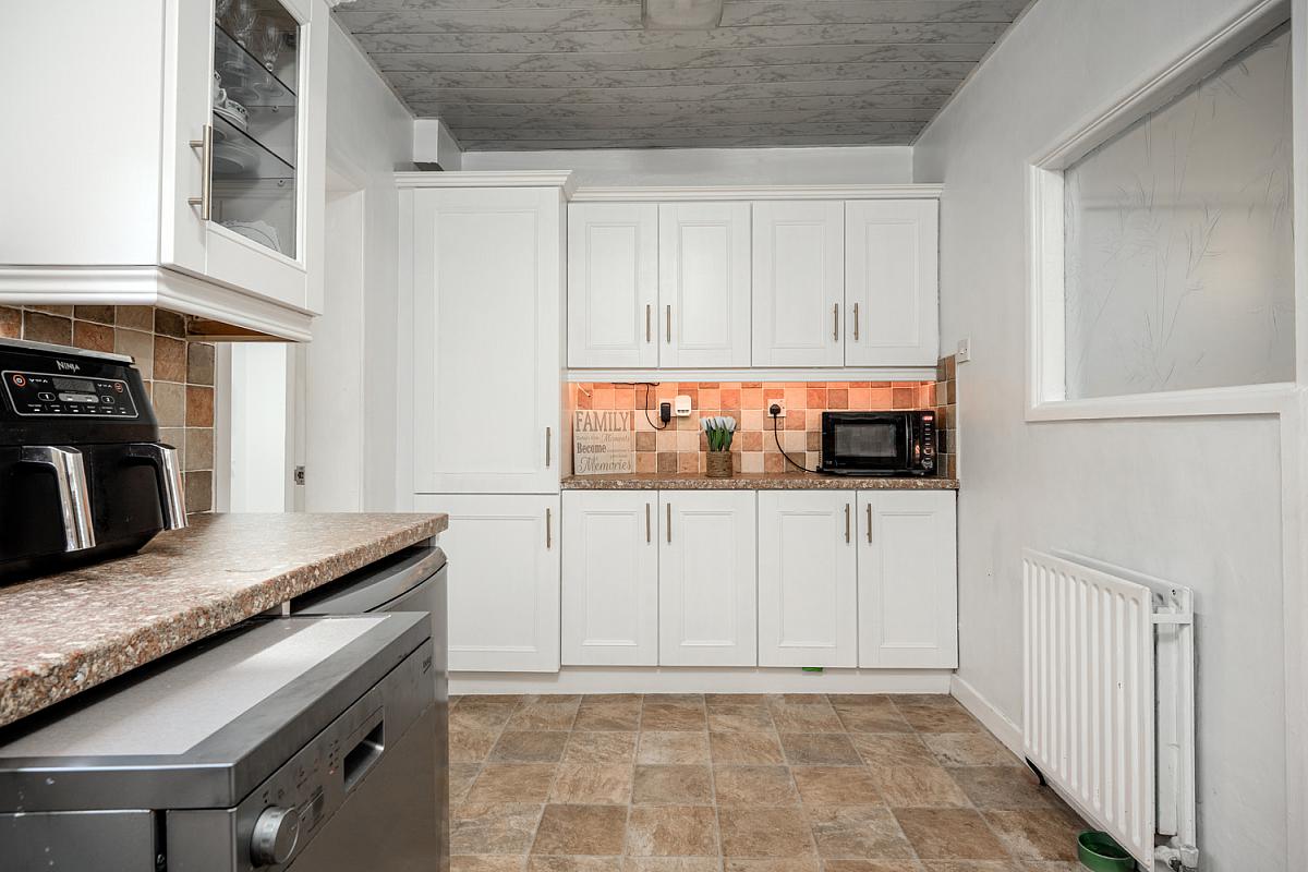 With bowl and half single drainer stainless steel sink unit, high and low level built in units with tiling between, under unit lighting, integrated gas hob, integrated stainless steel oven, extractor fan above, tiled splashback, space for fridge, plumbed for automatic washing machine, glass display cabinets, larder cupboard, drawer bank and PVC sheeted ceiling.