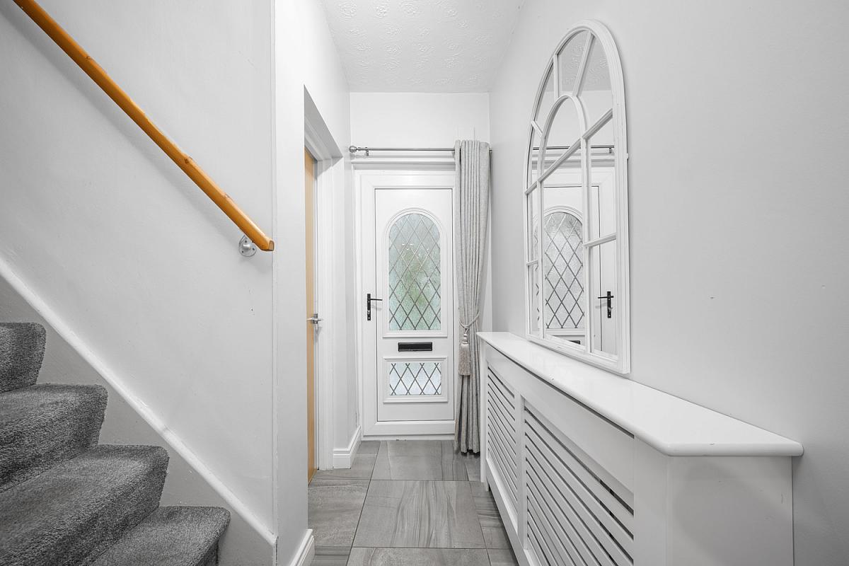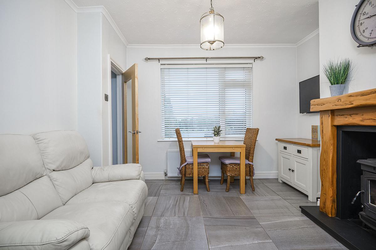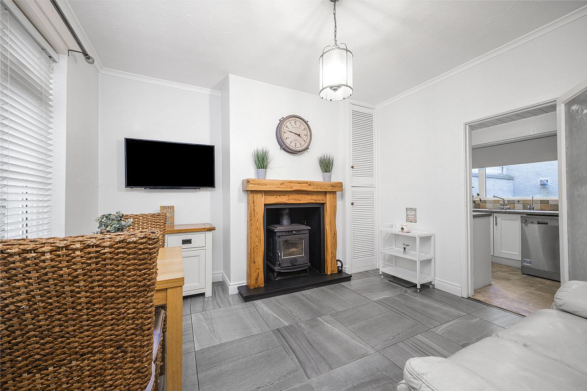 With pine surround fireplace with recess for multi burner, slate hearth, concealed shelving with Louvre style doors, under stairs storage, coving and tiled floor. Frosted glass panel door to: