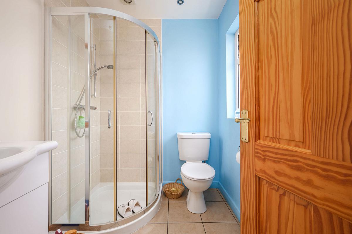 off with fully tiled walk in shower cubicle with mains shower, w.c., wash hand basin with tiled surround, storage below, recessed lighting and tiled floor.