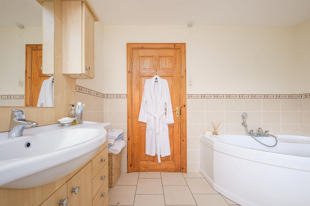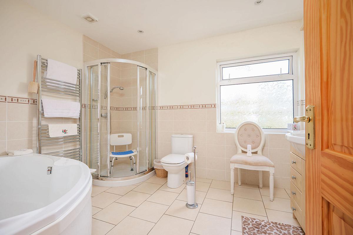 With white suite comprising w.c., wash hand basin set in vanity unit with cupboards below and storage above with recessed lighting in pelmets, fully tiled walk in shower cubicle with mains shower, corner bath with telephone hand shower, half tiled walls, heated towel rail, recessed lighting, extractor fan and tiled floor.