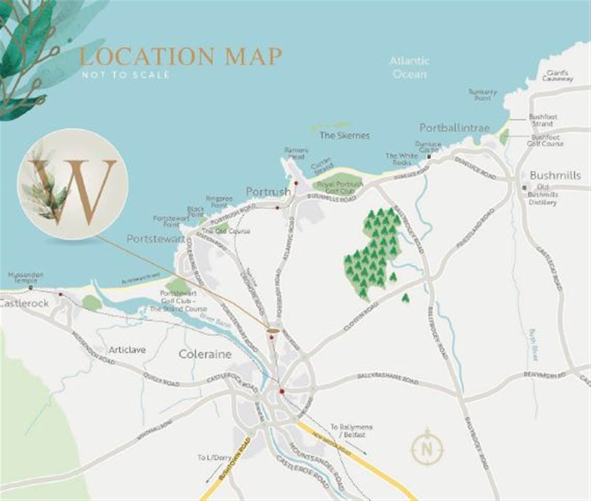 From the Lodge Road roundabout proceed onto the Ring Road and drive straight through the Ballycastle Road roundabout and Bushmills Road roundabout. At the Portrush Road roundabout, also known as the "Magic" roundabout, take your first exit (left) onto Atlantic Road. Take your first right into Willowfield Drive and follow the road as it bends left. The Willowfield development site will be situated at the end of this road, backing onto the railway tracks.