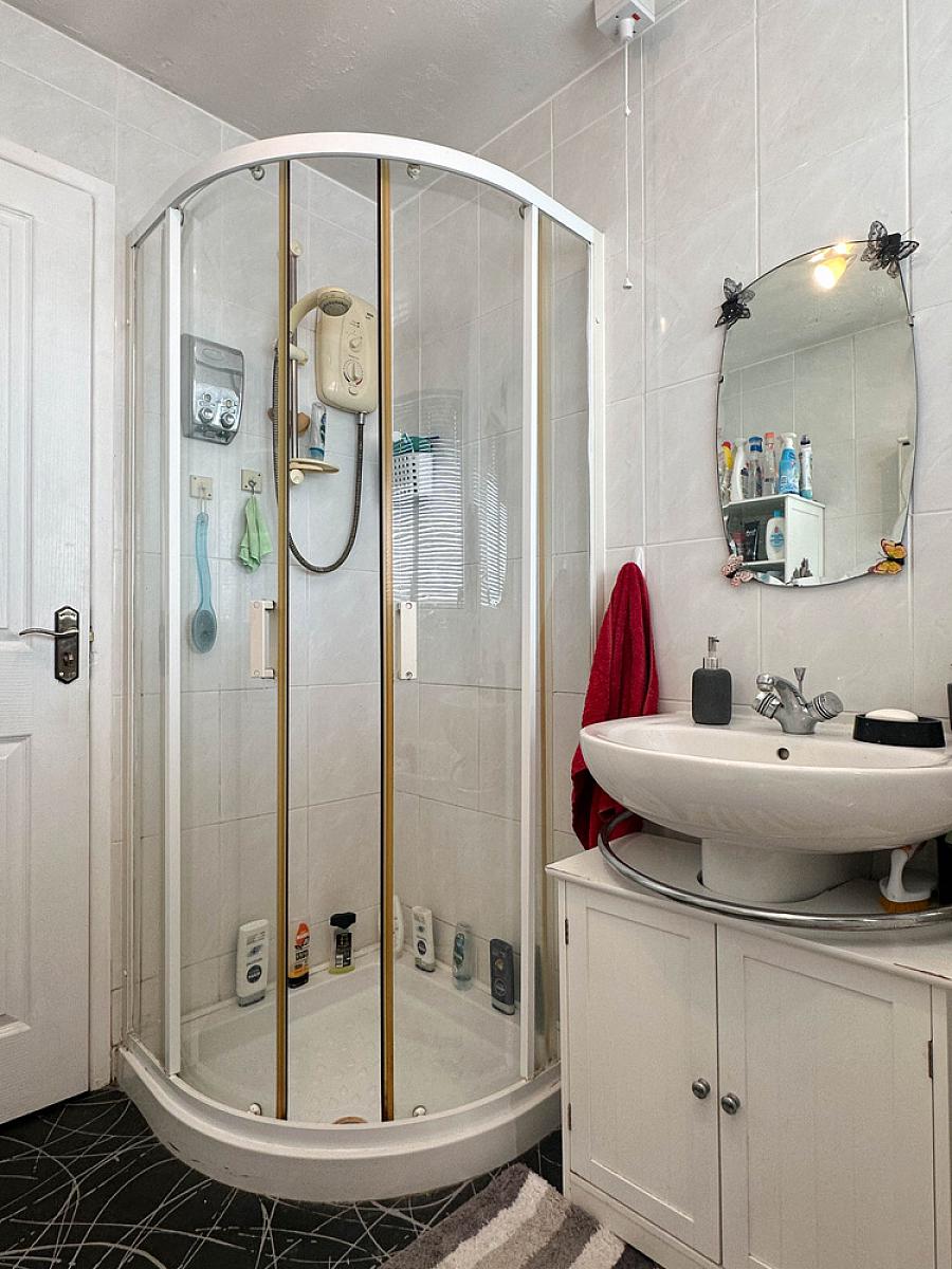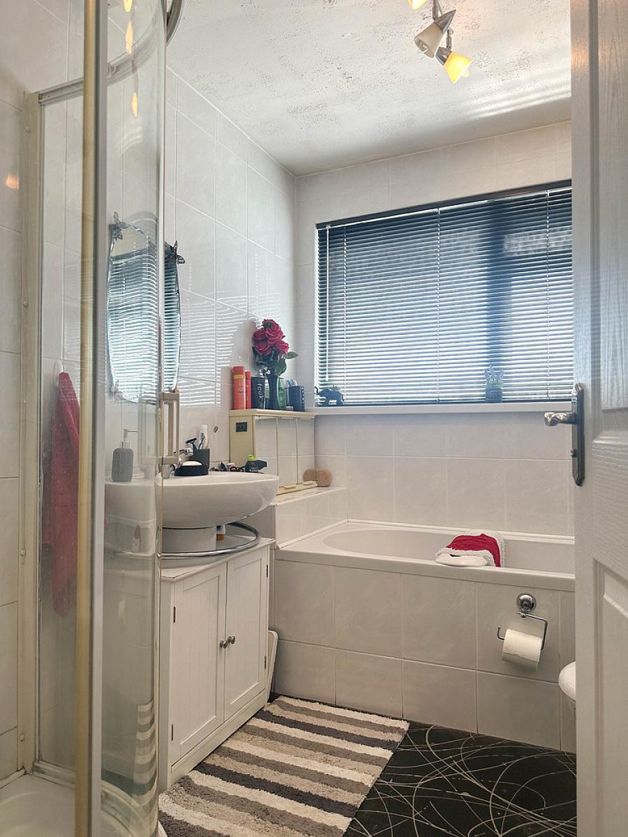 Comprising panel bath, telephone hand shower, wash hand basin, w.c., corner shower cubicle with Mira Sprint electric shower fitting, fully tiled walls.