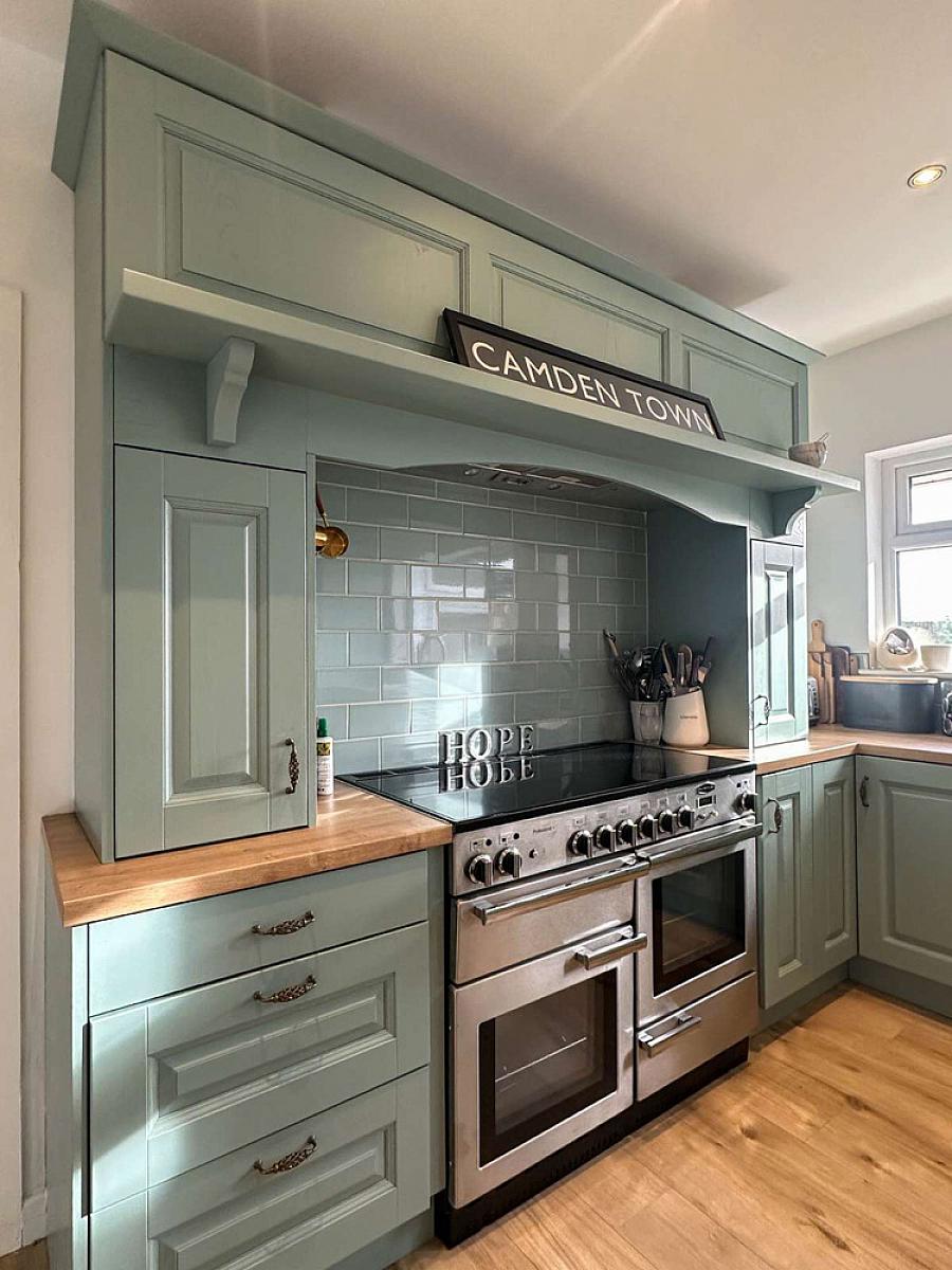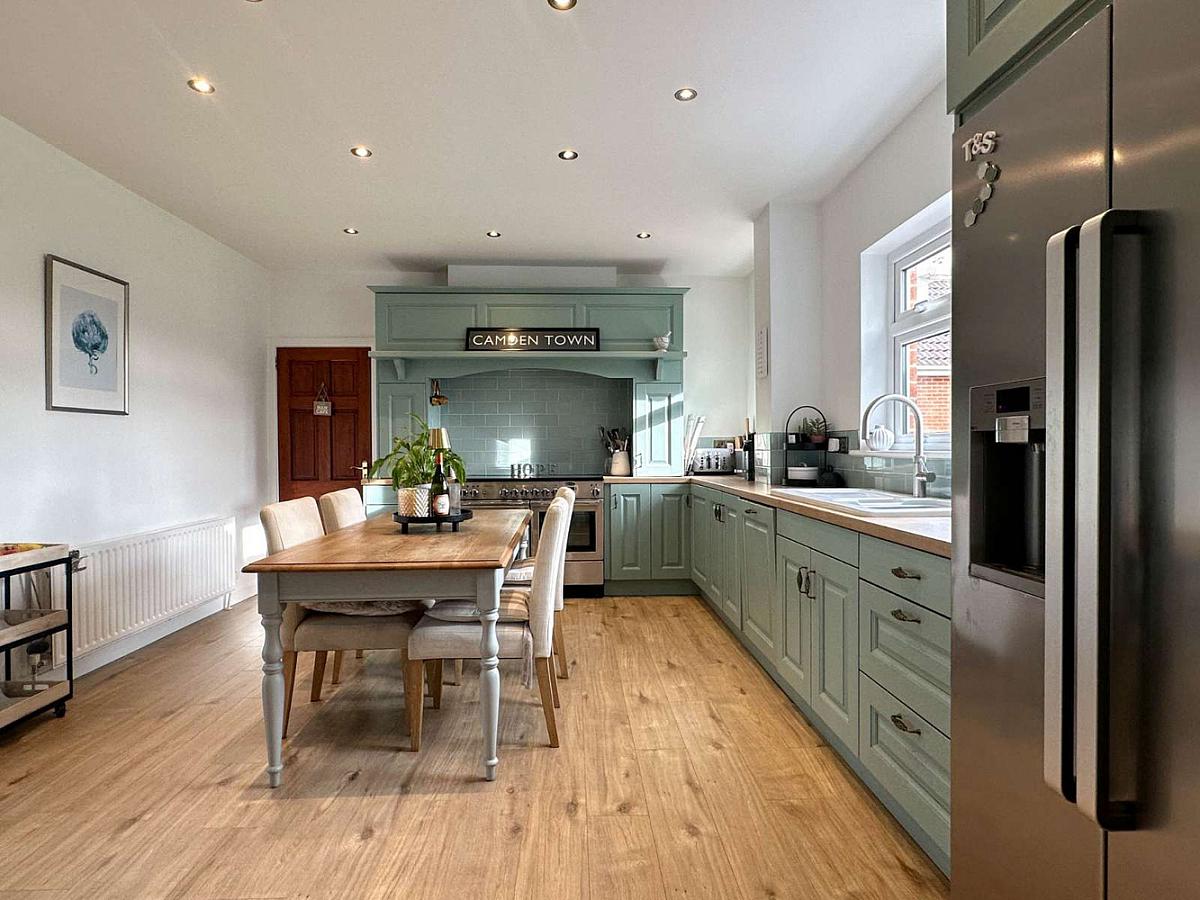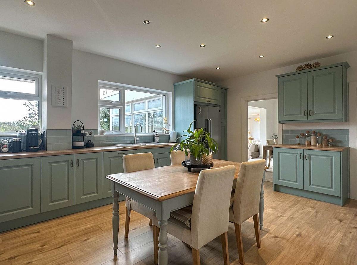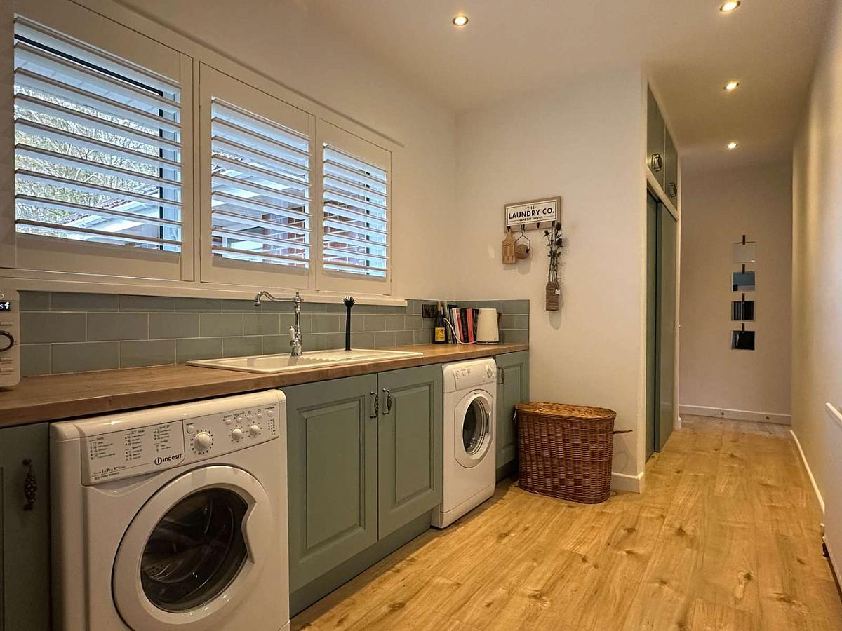 (Max) with low level units, sink unit, plumbed for washing machine, built in storage, recessed lighting and laminate flooring.