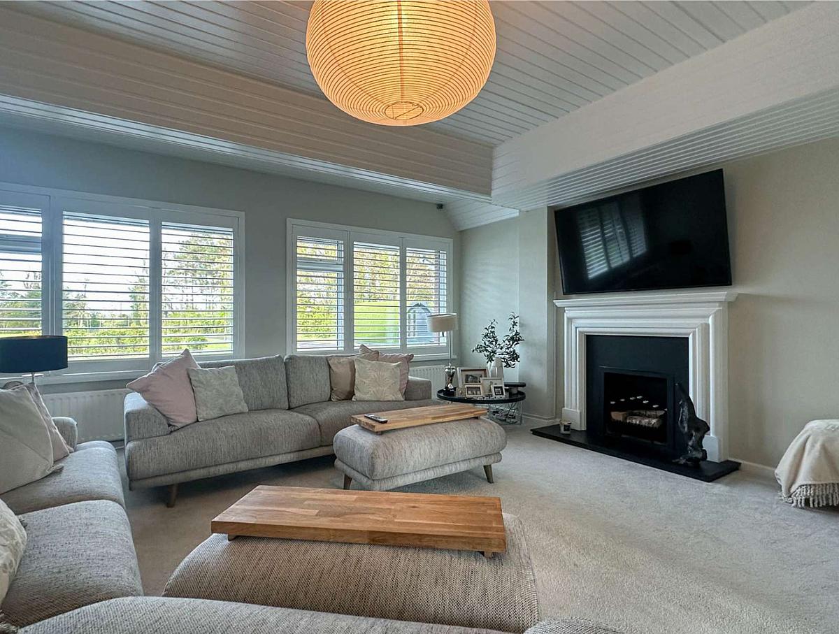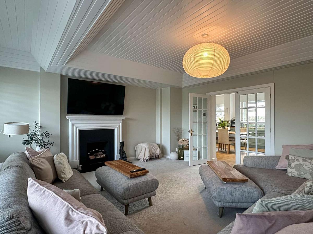 With feature surround fireplace with tiled hearth, feature sheeted ceiling.