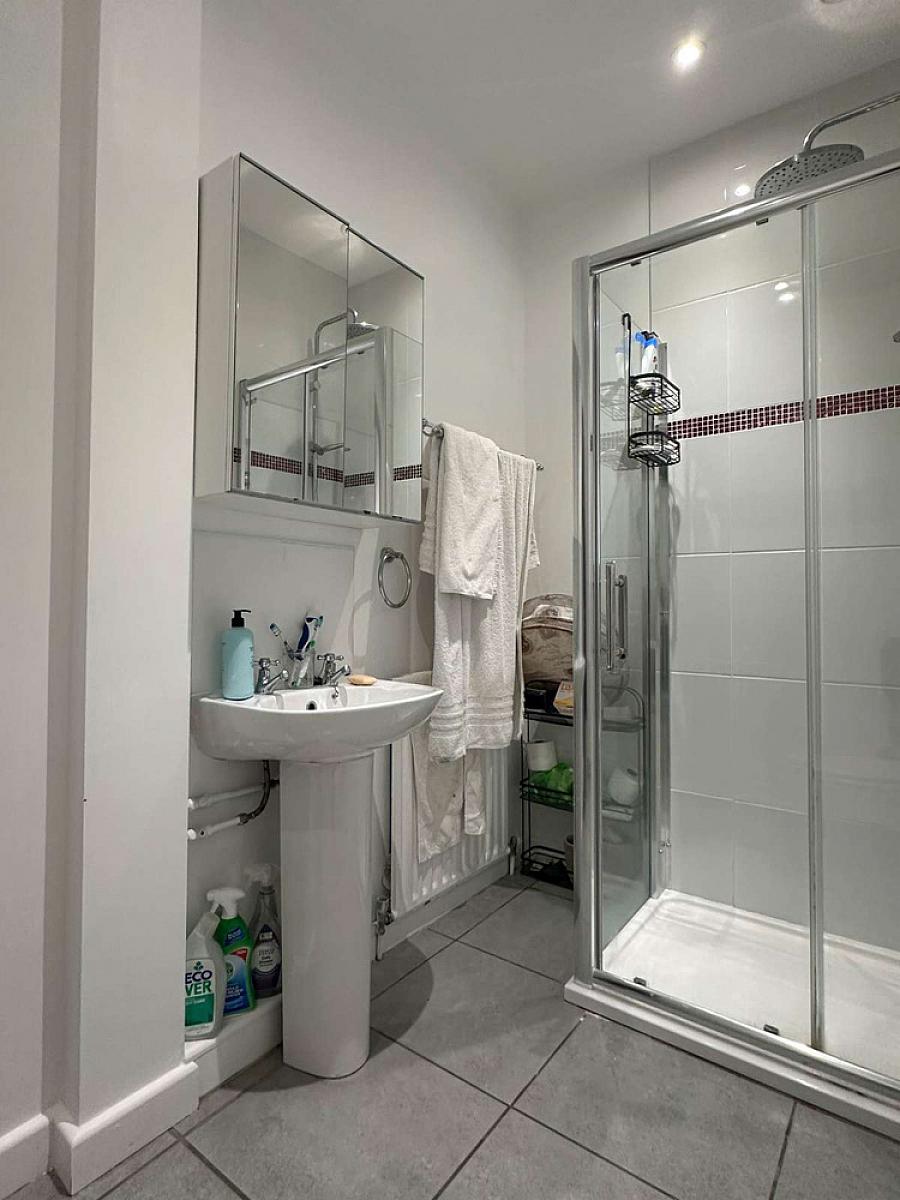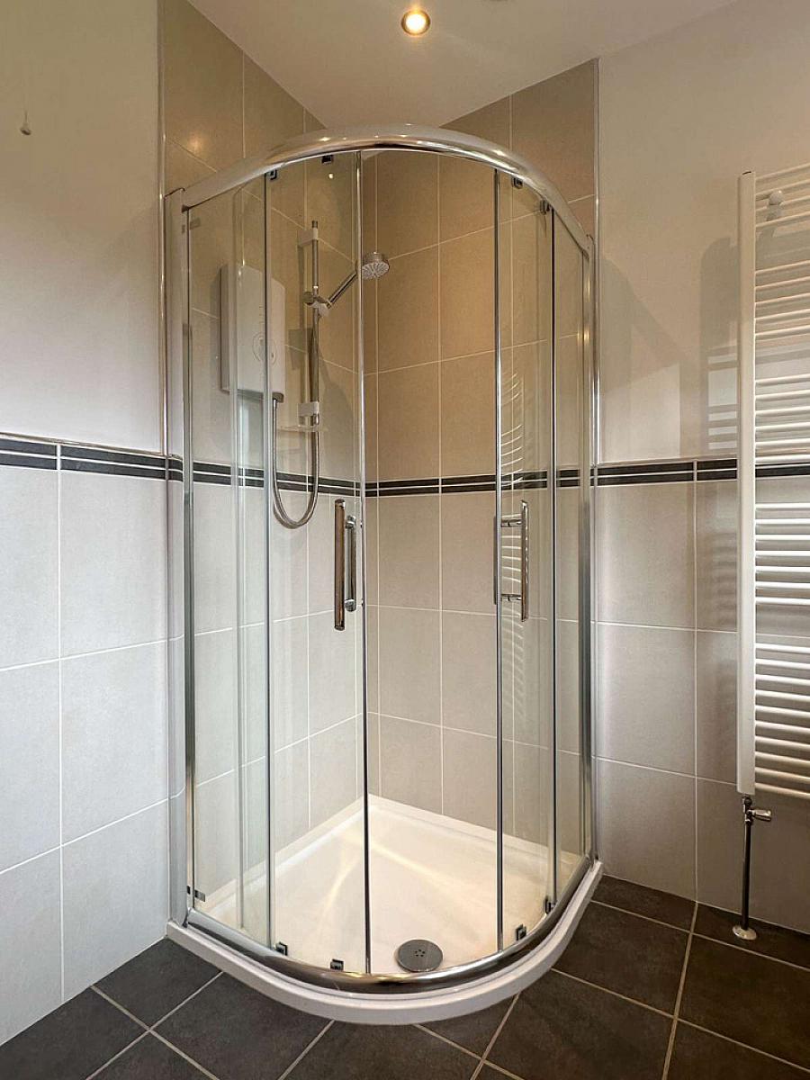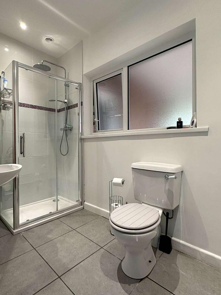 Comprising fully tiled walk in large shower cubicle with rainfall shower head, wc, wash hand basin, recessed lights, extractor fan, tiled walls and floor.