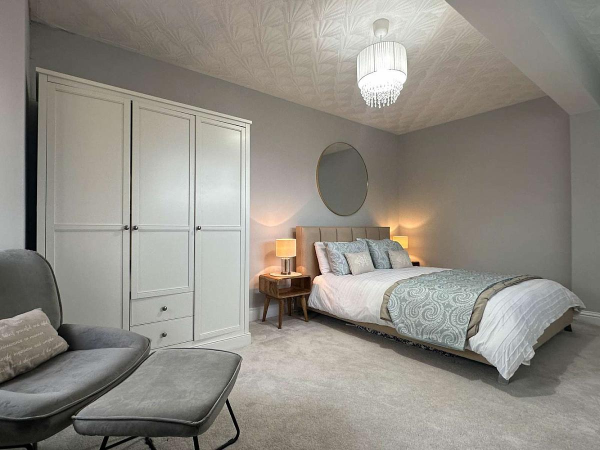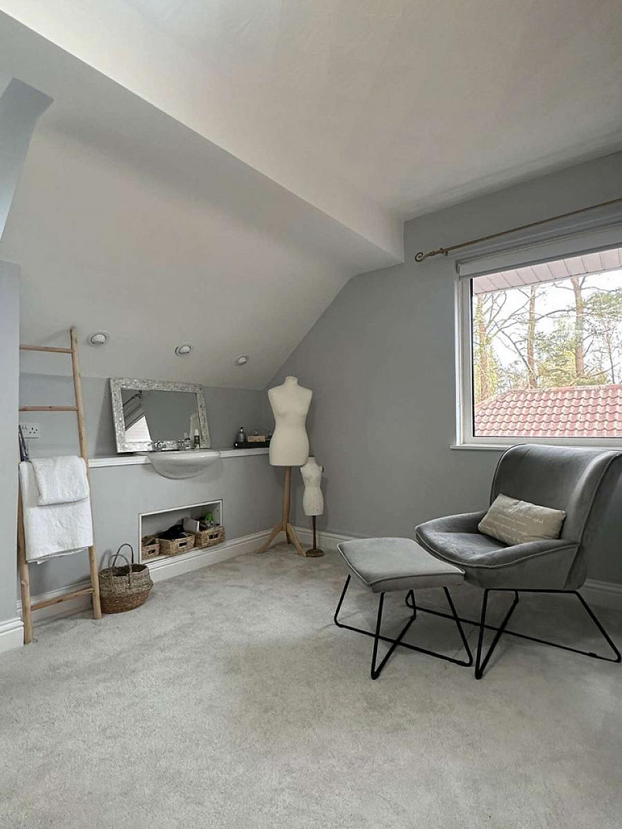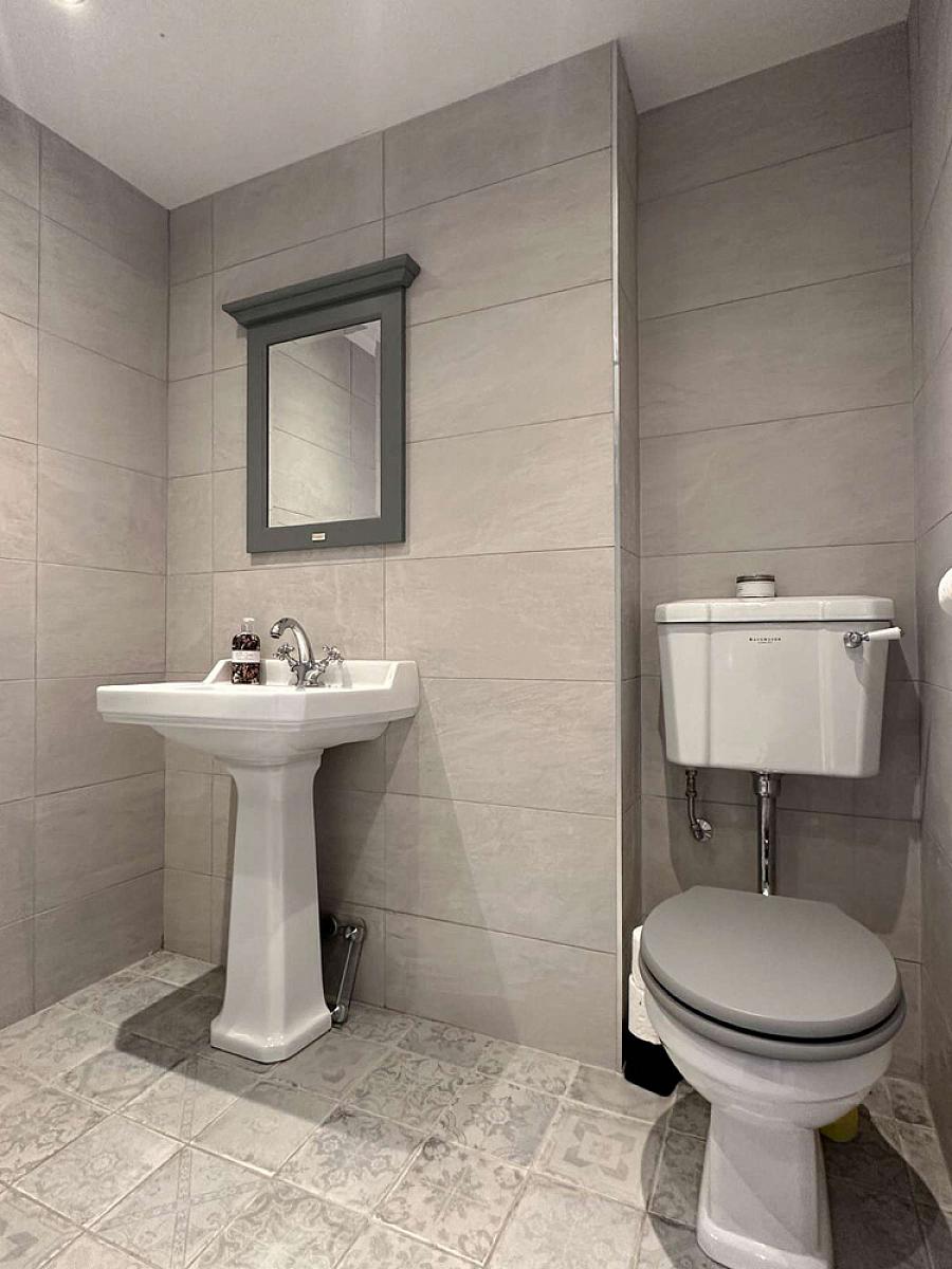 Comprising fully tiled walk in large shower cubicle with rainfall shower head, wc, wash hand basin, recessed lights, extractor fan, tiled walls and floor.