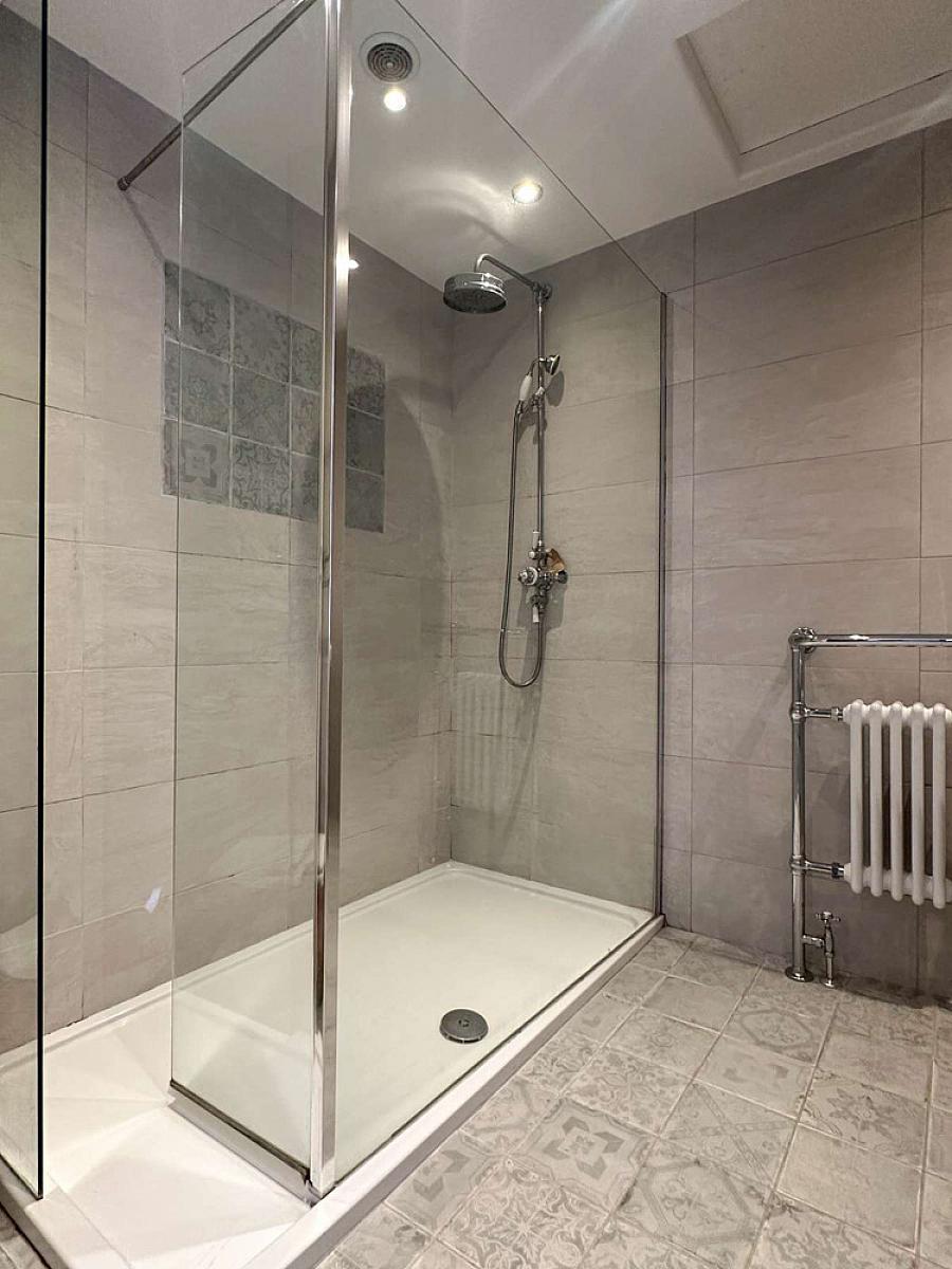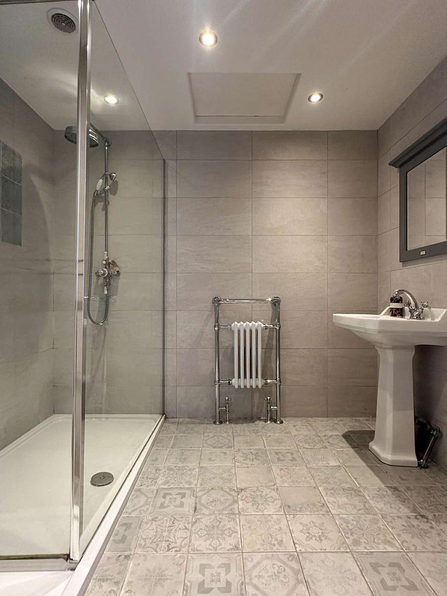 comprising fully tiled walk in shower cubicle with rainfall shower head, wc, wash hand basin, recessed lights, extractor fan and tiled floor.