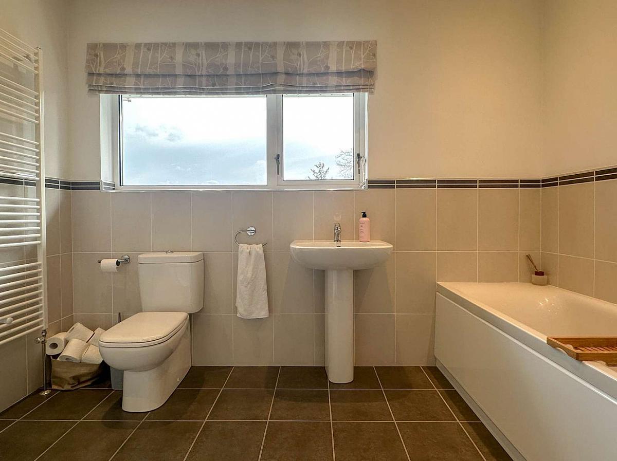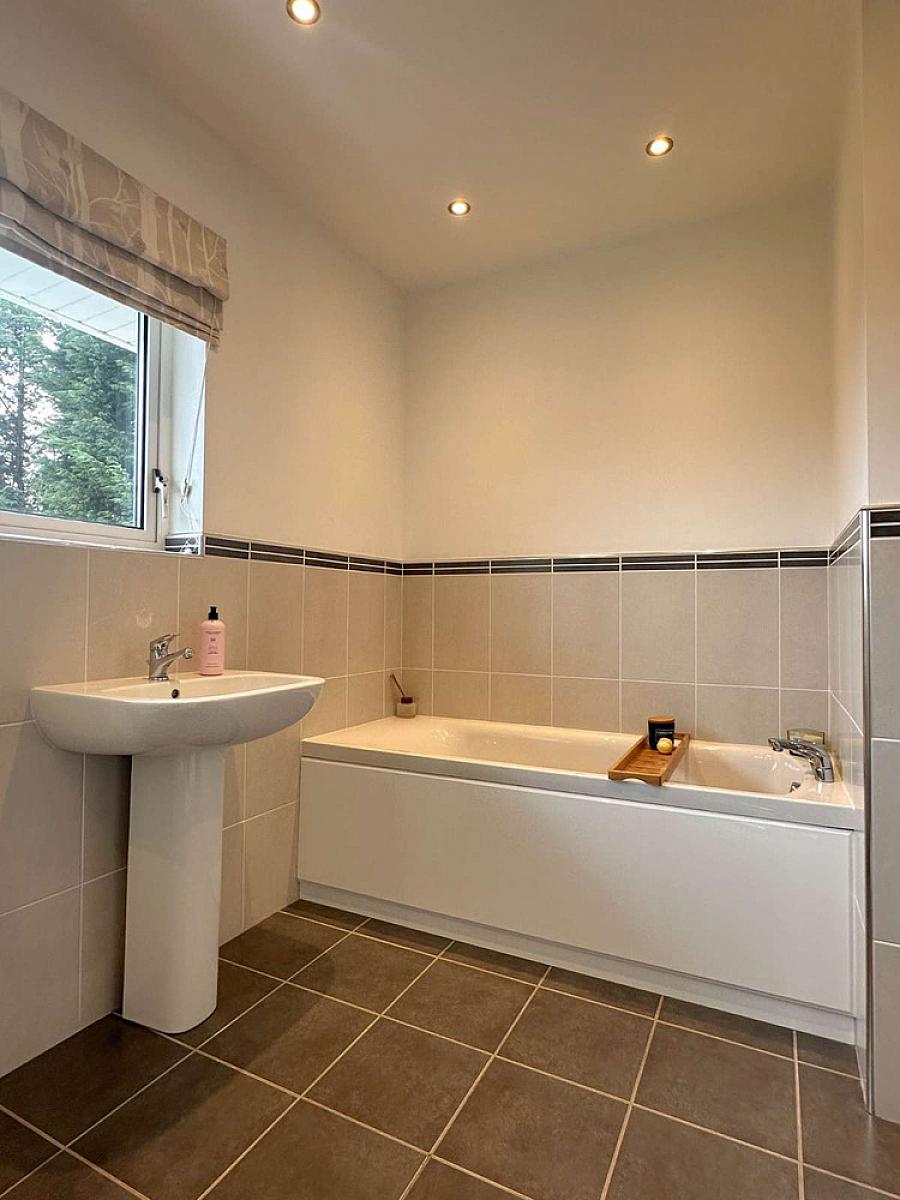 Comprising panel bath, fully tiled walk in shower cubicle, wc, wash hand basin, recessed lights, extractor fan, half tiled walls and tiled floor.