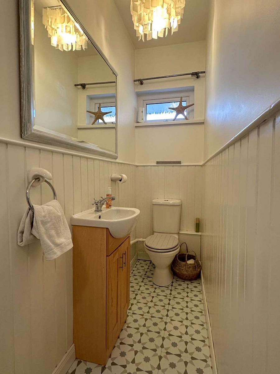 Comprising w.c and wash hand basin, half panelled walls and under stair storage.