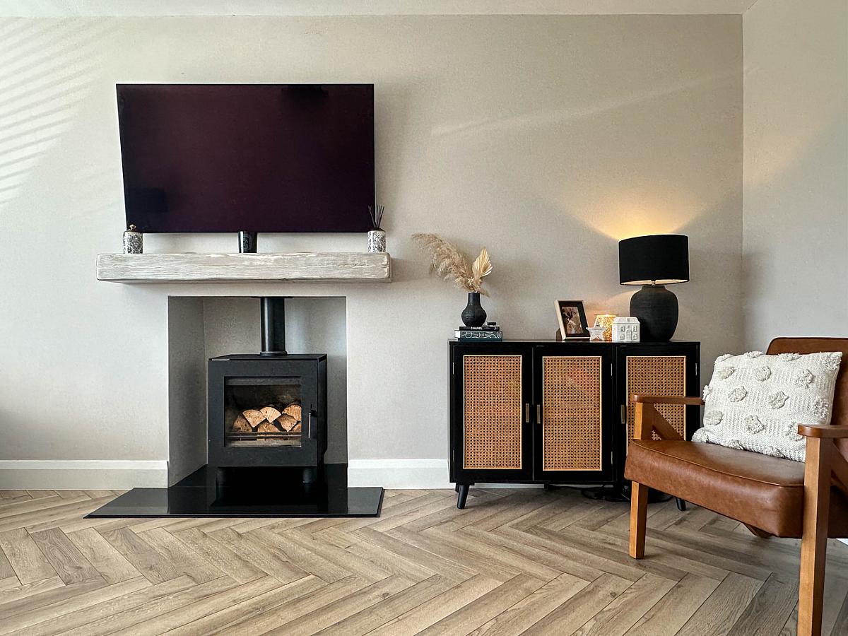 with recess style fireplace, marble hearth, mantle, wooden effect flooring.