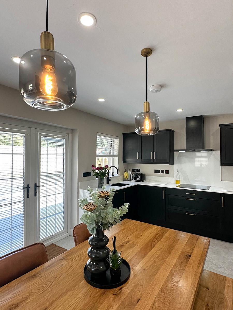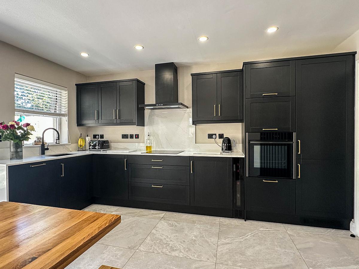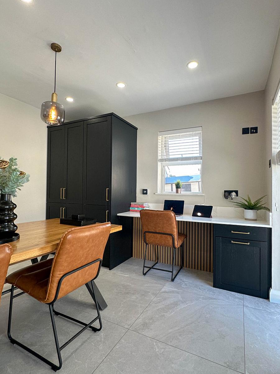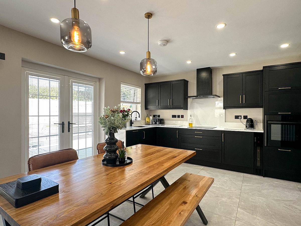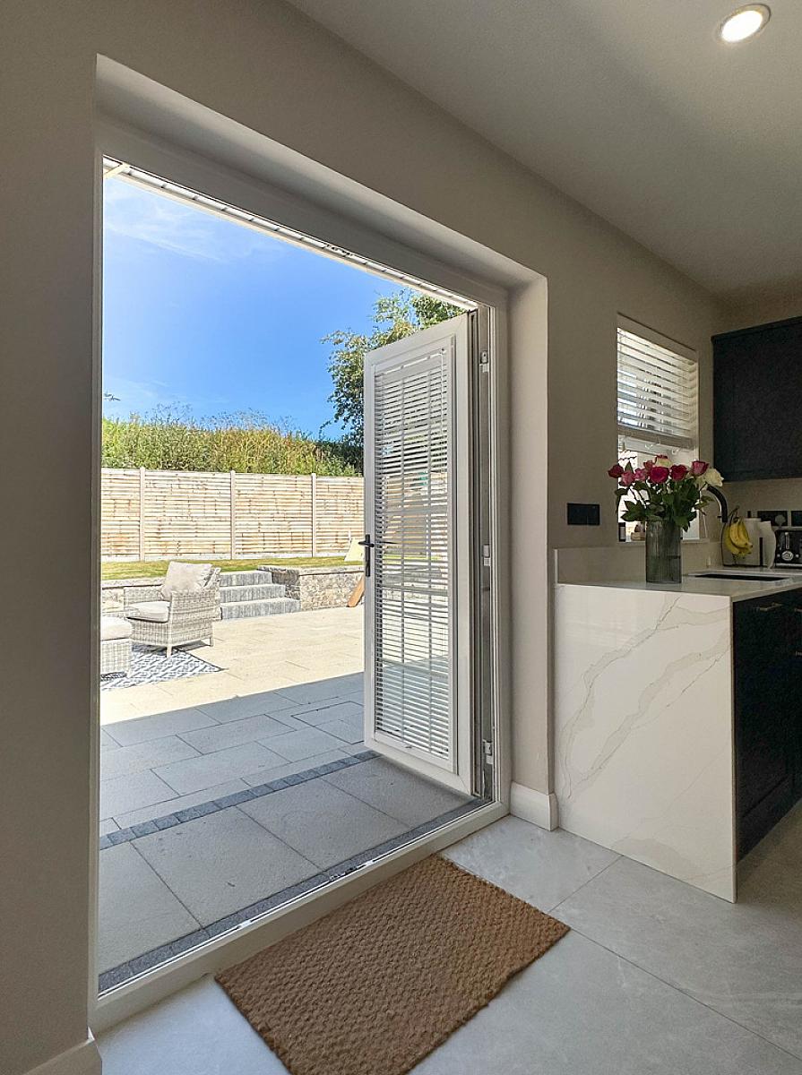 (Max) with eye and low level units, granite worktop, upstand, splashback behind hob and window sills, Neff oven, Bosch induction hob, integrated Bosch dishwasher, integrated Hisense fridge / freezer, wine fridge, extractor fan, one and a half bowl Franke sink unit, housing for microwave, tiled floor, recess lighting, feature radiator. Utility cupboard with housing for washing machine and tumble dryer. Larder unit. Desk area with low level unit and panelled wall below the desk. Glass panelled door from hall. uPVC French doors to the rear garden and patio area.