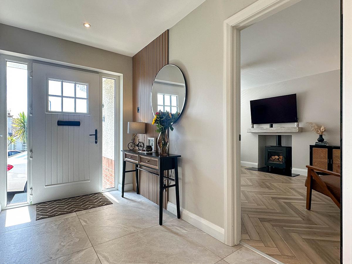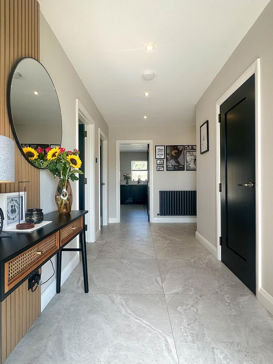 With composite front door and glass side panels, feature wall panel, tiled floor, cloaks cupboard, linen cupboard with pressurised tank, recess lighting, feature radiator, access to roof space with larder, part floored and part shelved.