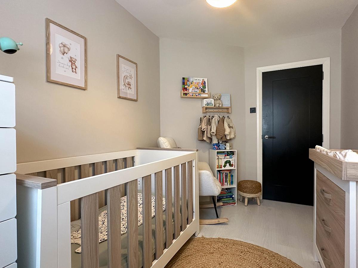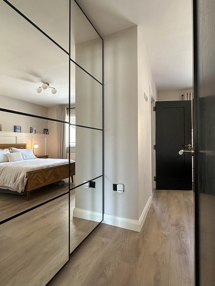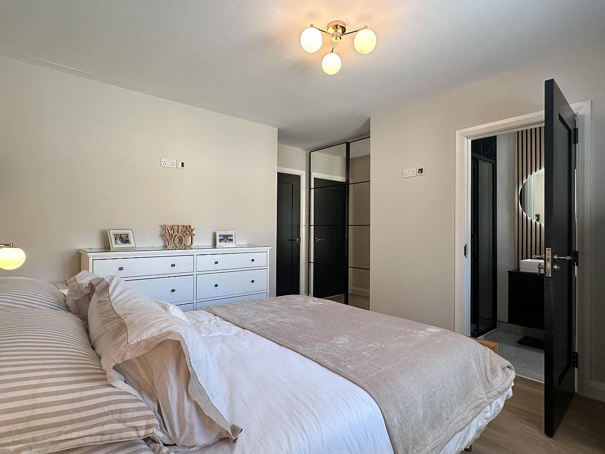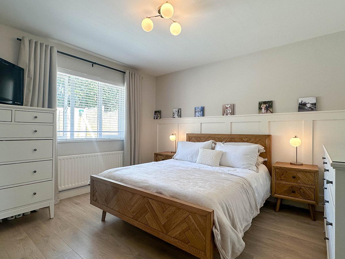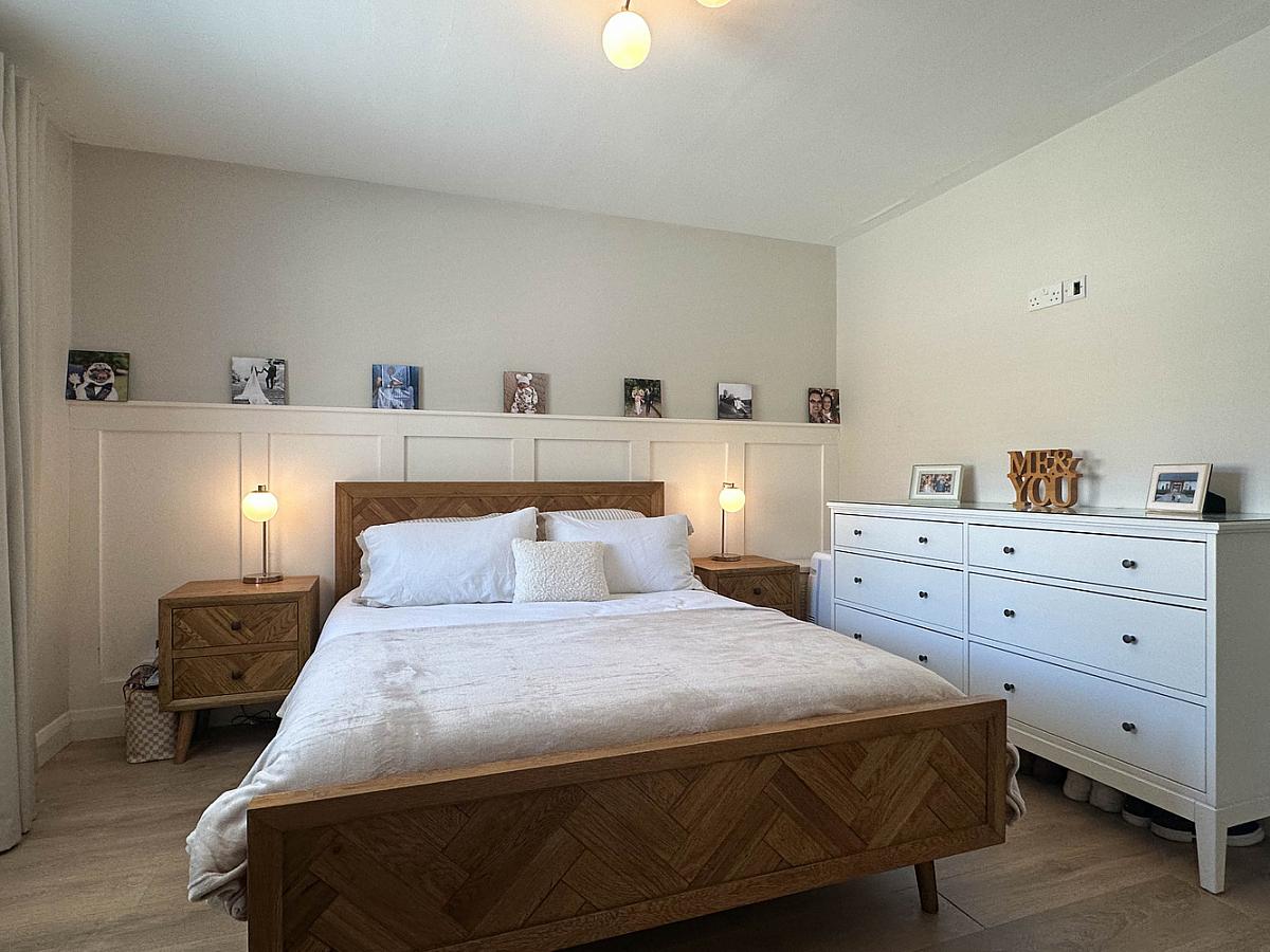 plus built in mirrored sliderobes, wooden effect flooring, half panelled wall behind the bed with shelf.