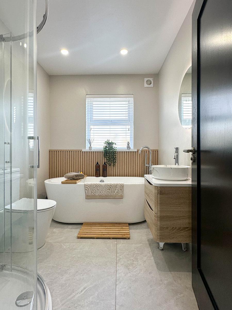 Comprising freestanding bath with shower attachment, wash hand basin set on vanity unit, w.c., PVC panelled corner shower cubicle with mains rainfall and body shower fittings, tiled floor, heated towel rail, recess lighting, extractor fan, half panelled wall behind bath, circular touch screen circular mirror.