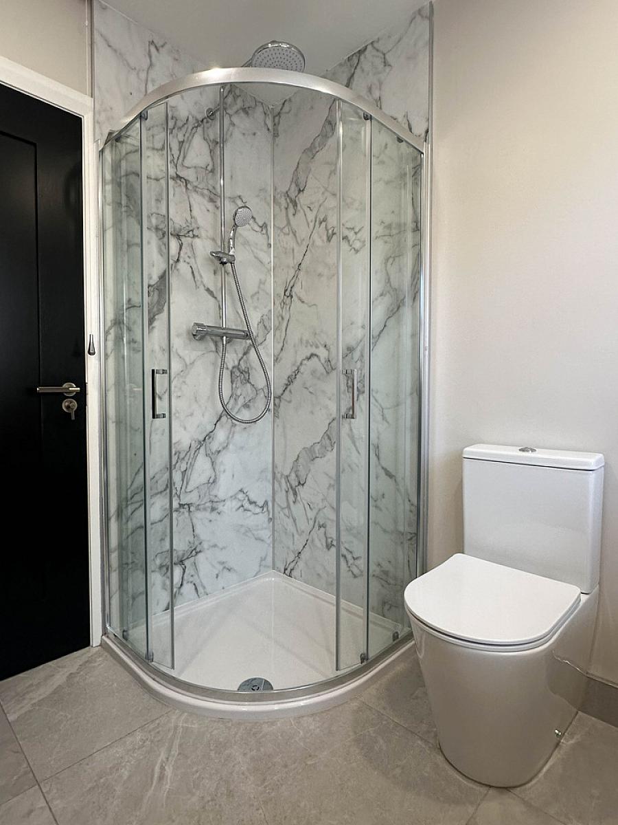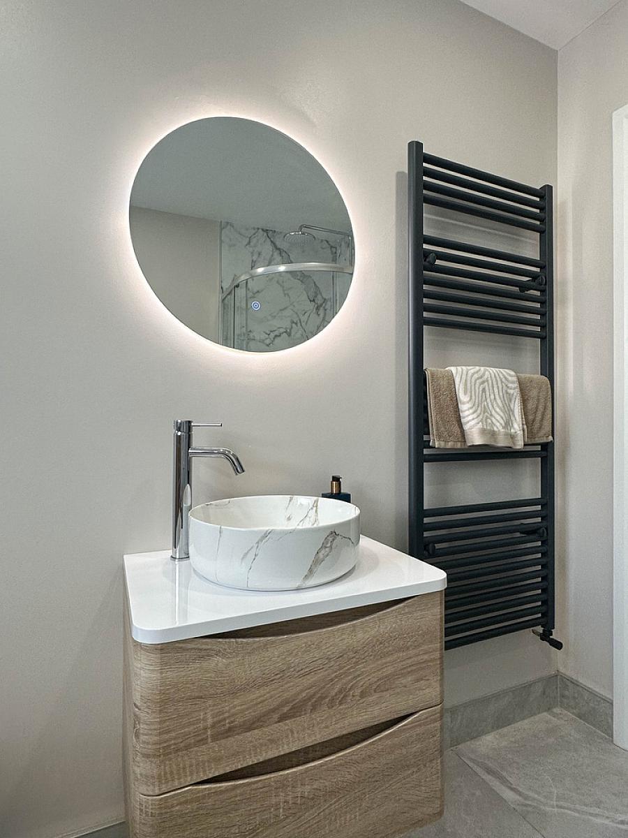 Comprising PVC panelled shower cubicle with Mira mains rainfall and body shower fittings, wash hand basin set on vanity unit, w.c., heated towel rail, tiled floor, extractor fan, recess lighting, feature wall panel with circular touch screen circular mirror.
