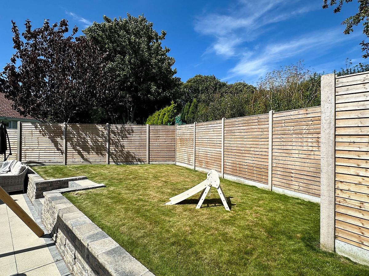 Garden laid in lawn to the front with small boundary wall and 2 trees. 3 steps up to the front door. Extensive paved patio area to the rear with steps leading up to the rear garden laid in lawn, fully enclosed by fencing. Paved path to the side. Pedestrian gate to side. Water tap to the rear. Outside lights to the front and rear.