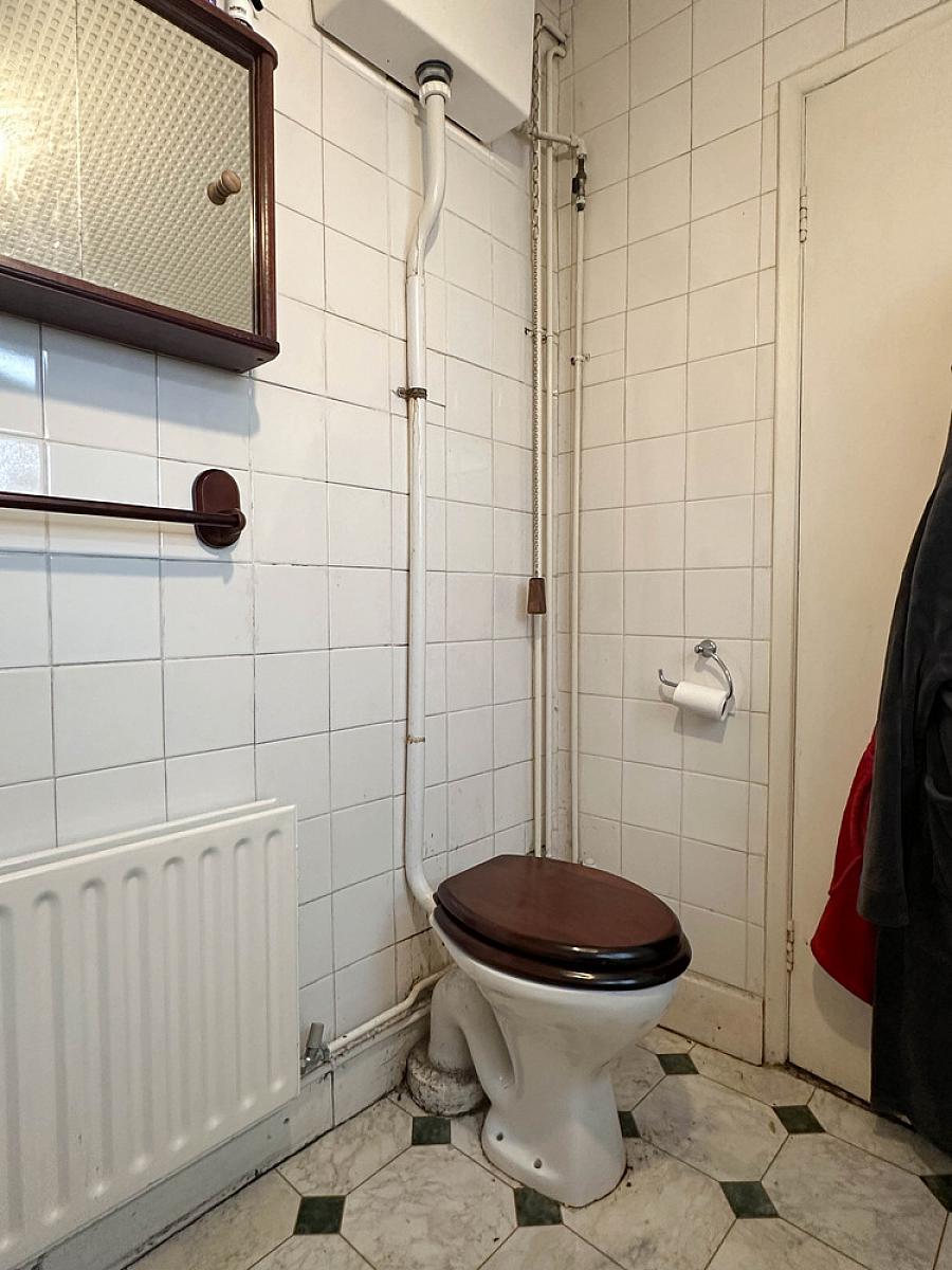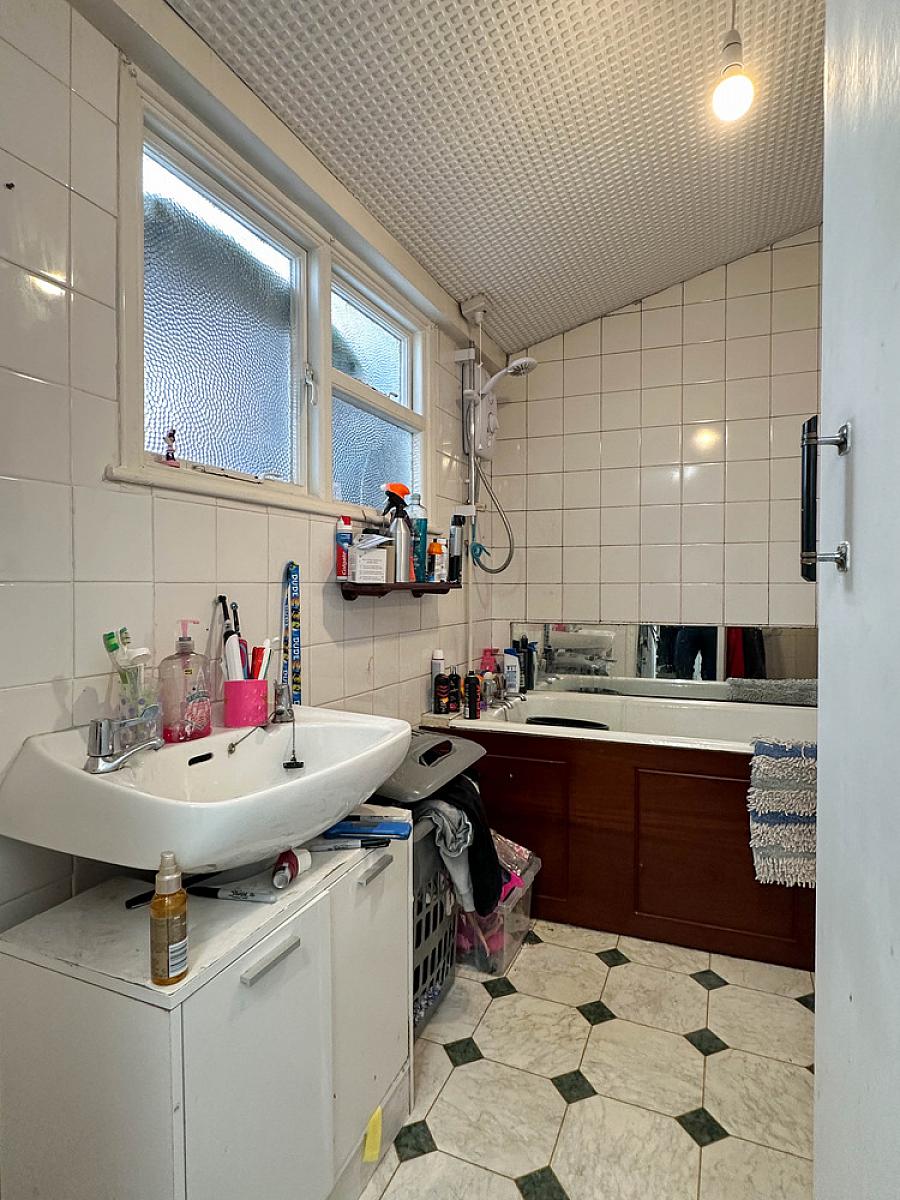 Comprising panel bath with Mira electric shower fitting over, high flush w.c., wash hand basin, tiled walls, extractor fan.