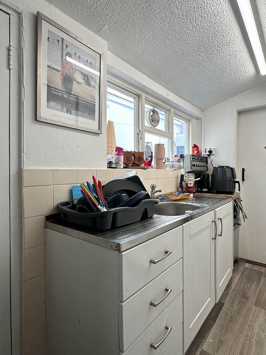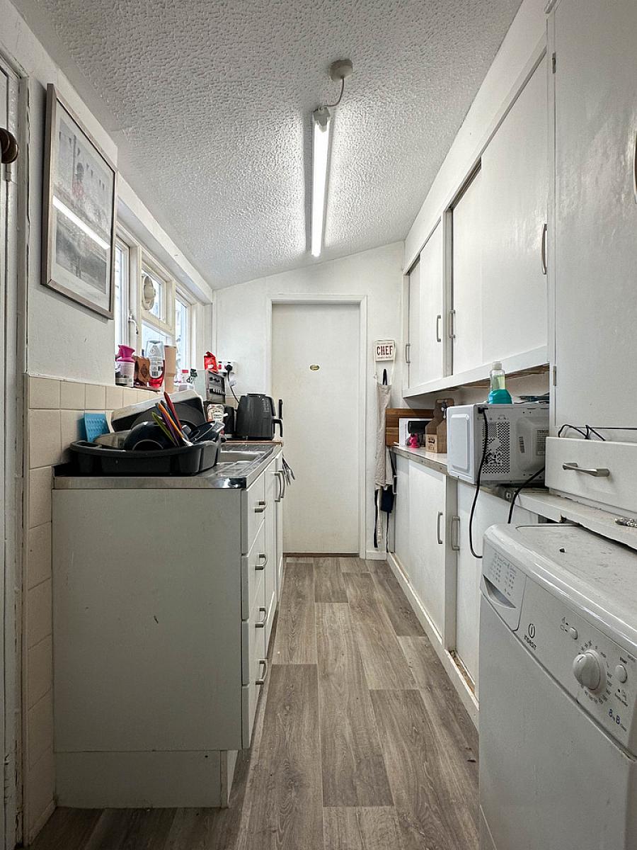 with eye and low level cupboards, space for cooker, double drainer stainless steel sink unit, strip lighting, door to rear yard and door to Bathroom. No radiator.